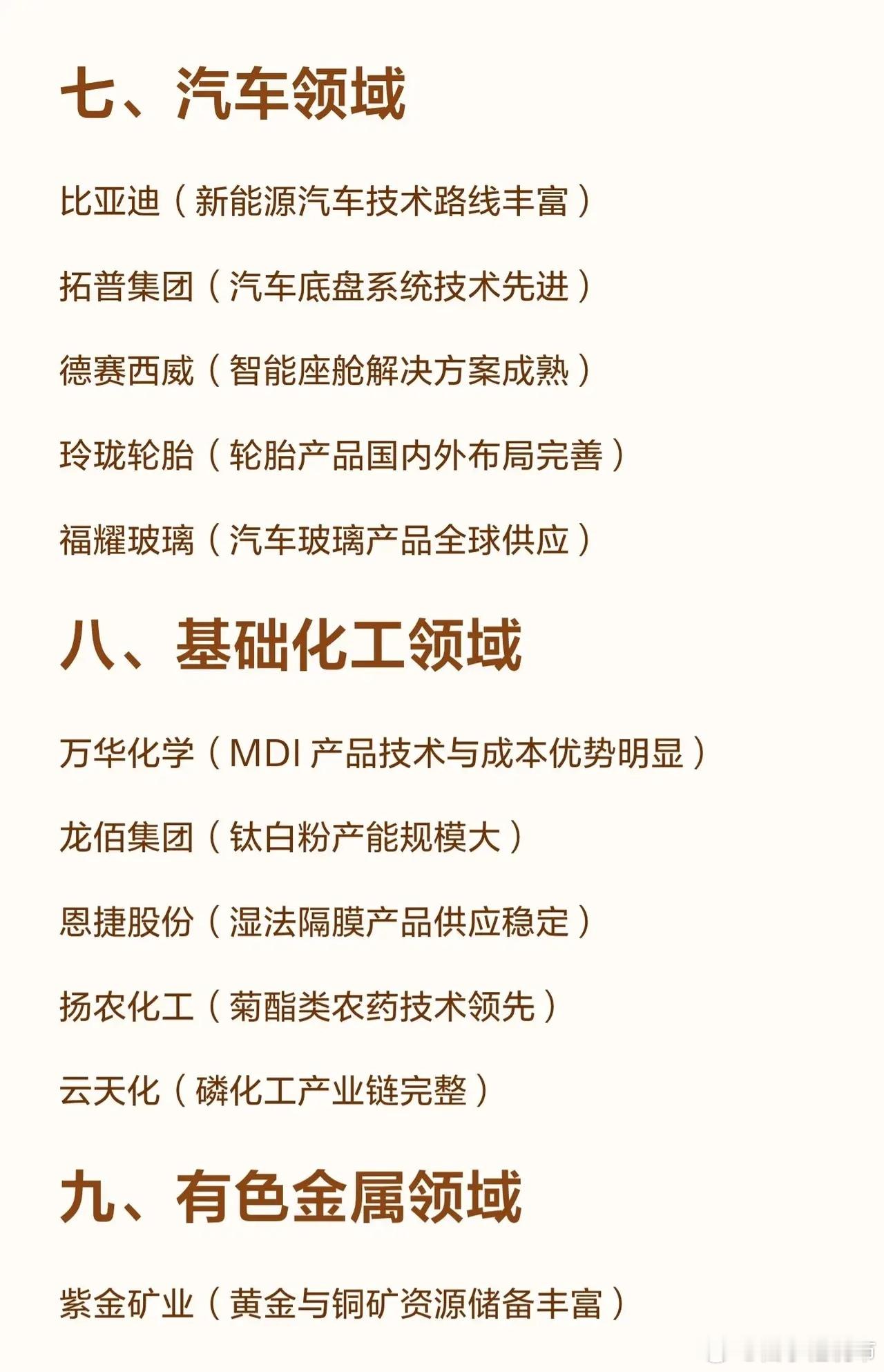 比亚迪(新能源汽车技术路线丰富)、拓普集团(汽车底盘系统技术先进)、德赛西威(智能座舱解决方案成熟)、玲珑轮胎(轮胎产品国内外布局完善)、福耀玻璃(汽车玻璃产品全球供应)。