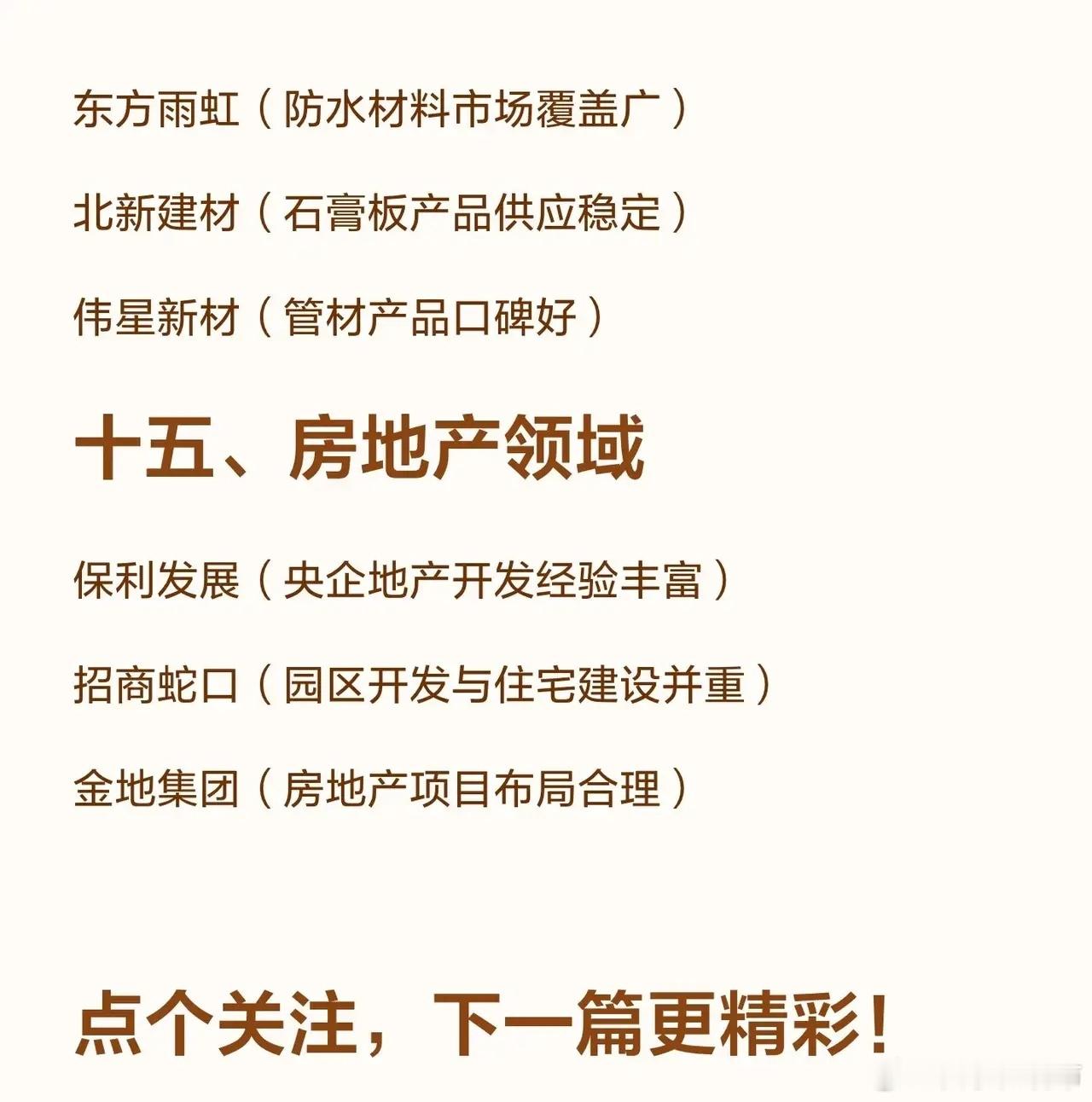 保利发展(央企地产开发经验丰富)、招商蛇口(园区开发与住宅建设并重)、金地集团(房地产项目布局合理)。