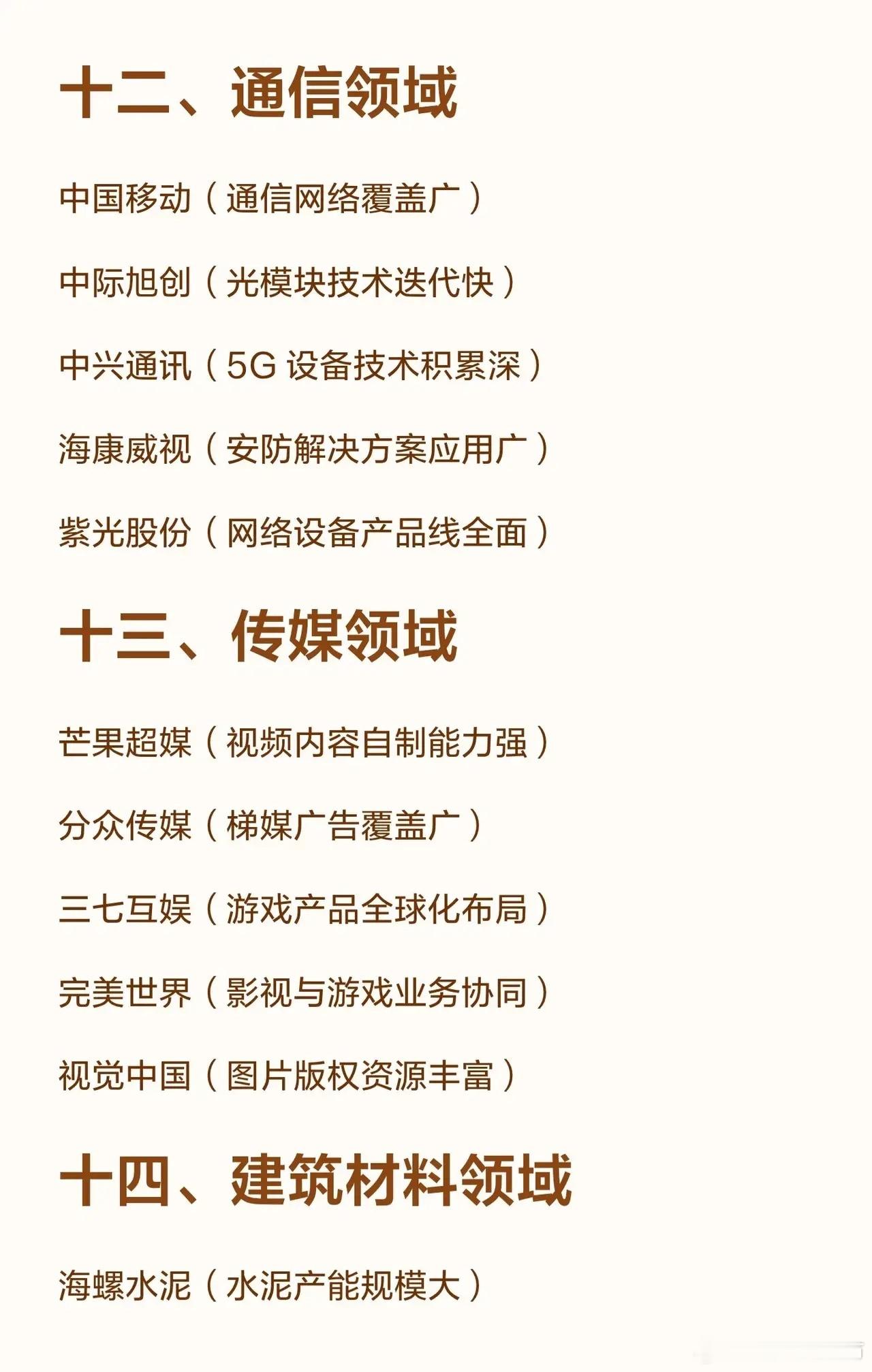 中国移动(通信网络覆盖广)、中际旭创(光模块技术迭代快)、中兴通讯(5G设备技术积累深)、海康威视(安防解决方案应用广)、紫光股份(网络设备产品线全面)。