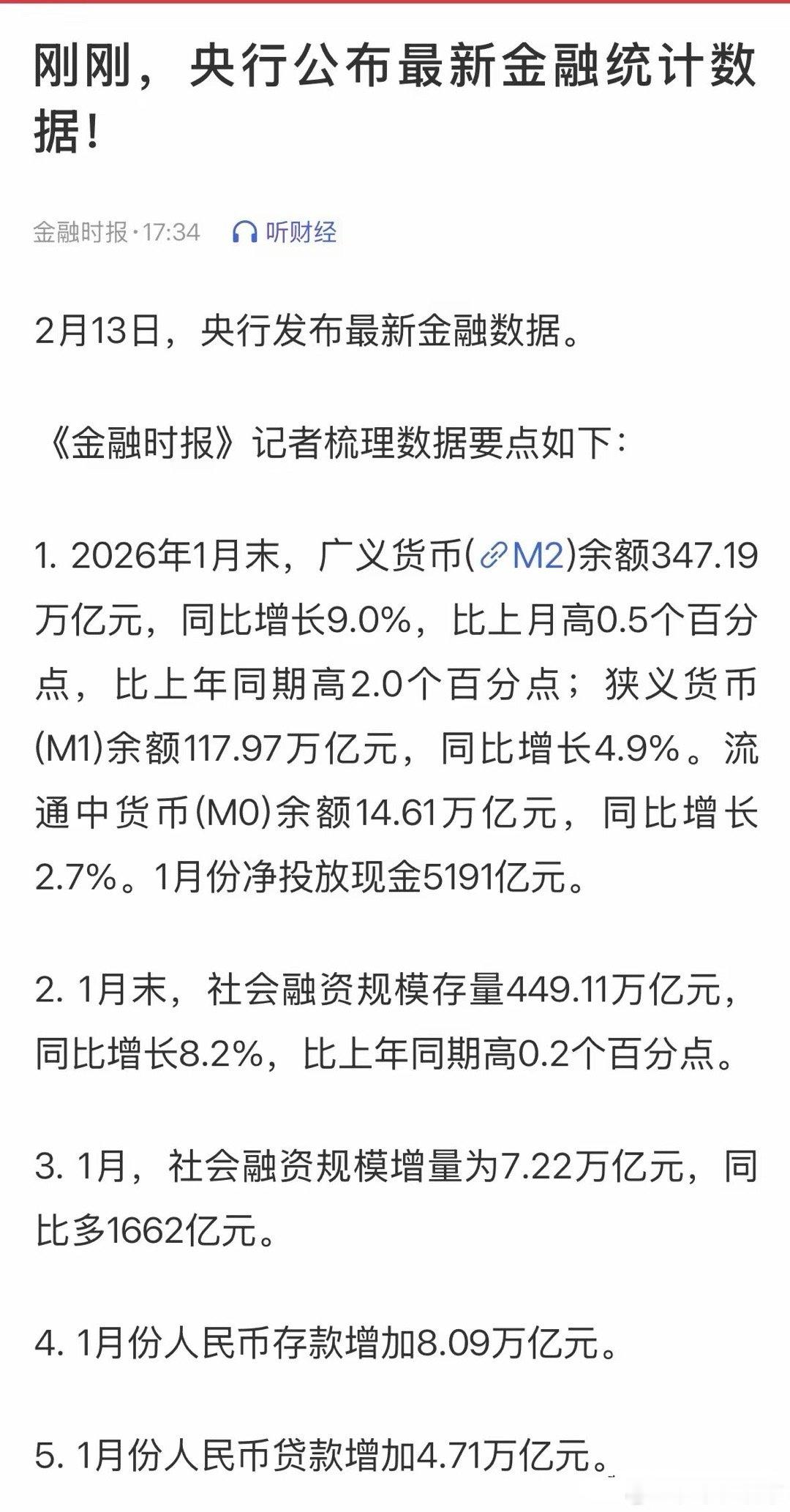 重磅利好消息1月社会融资规模和M2较快增长,A股节后继续大涨:春节节后慢牛可期!2月13日晚有人问央行盘后发布的数据是利好消息吗?确实是重磅利好消息,M2都347.19万亿元,增速9%,原因高于GDP的5%增速,说明货币资金面宽松;社会融资449.11万亿元,更猛了!很多人对这个利好没有概念,那么对比一下就知道了:美国2026年1月M2为22.40万亿美元,折合人民币156.25万亿元,美国商业银行信贷为17.43万亿美元,折合人民币121.58万亿元。换句话说,中国M2为美国M2的两倍多,社融三倍多。说明A股的货币环境是很宽松的,市场不差钱,缺真正优质的核心资产。