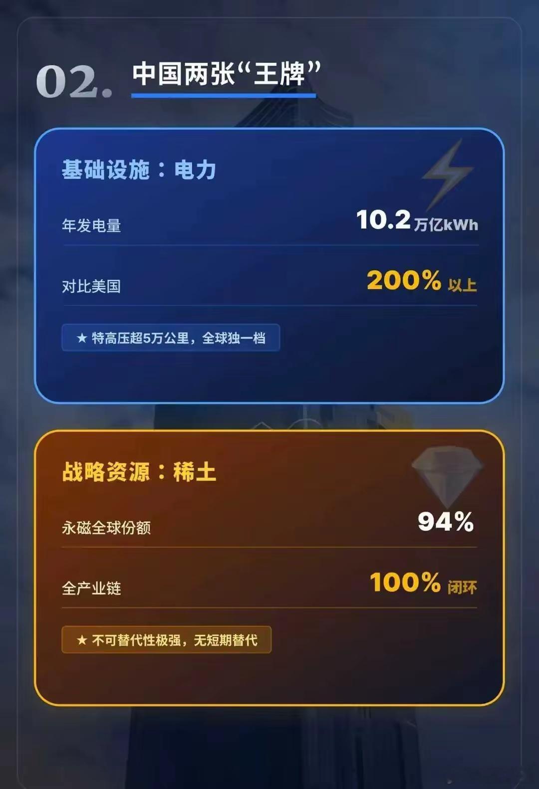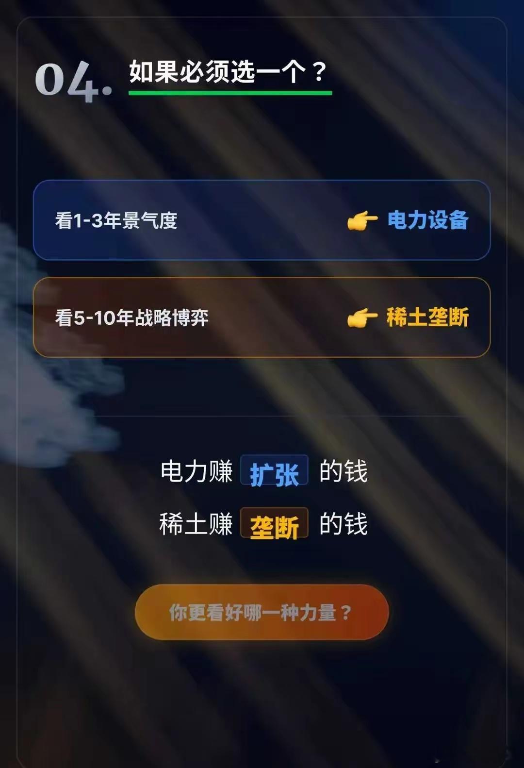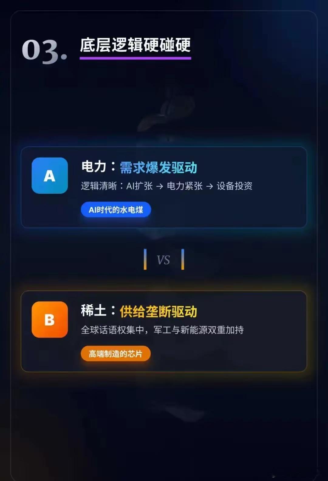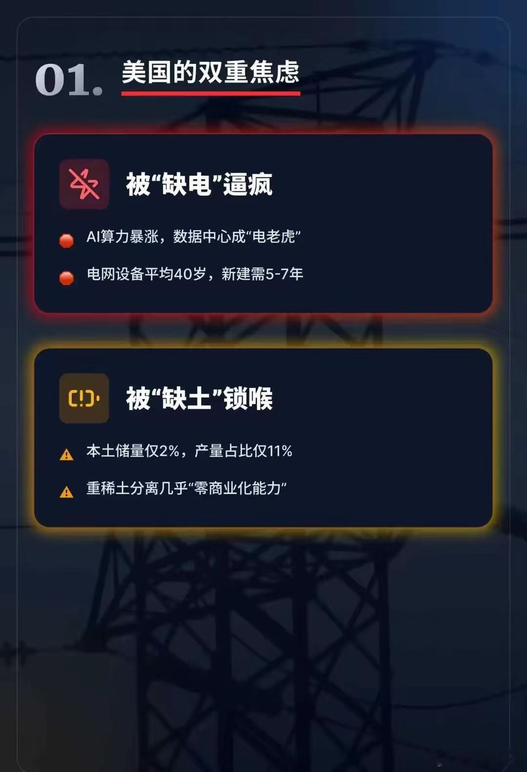 电力和稀土,选哪个?电力板块和稀土板块最近有个很有意思的现象:一边是美国被“缺电”逼到焦虑——AI算力暴涨,数据中心高度集中,电网老化、审批缓慢,新建输电线动辄5-7年;另一边是“缺稀土”让人坐立不安——美国稀土储量约2%,全球产量占比仅约11%,重稀土分离几乎没有商业化能力。【问题来了】电力和稀土,如果只能选一个方向看好,你站哪边?[一]先看电力:AI时代的刚需AI爆发不是故事,是实打实的电表在转。• GPT级别模型训练一次,耗电量惊人• 数据中心用电高度集中,少数州承担全国大部分算力• 传统能源退役加速,新能源建设周期长• 电网设备老化,输电设备平均年龄40年左右而对比来看:• 中国2024年总发电量约10.2万亿kWh,是美国的两倍多• 全国统一调度,输电损耗约5%• 特高压超过5万公里,全球独一档一句话:AI+电力=基础设施级别的长期需求。电力设备、储能系统本质是“卖水人”。只要算力扩张,电网必须扩容。⸻[二]再看稀土:真正的战略资源稀土的故事更“硬核”。• 中国储量占全球约48%• 全球产量占比约69%• 重稀土分离纯度可达99.99%• 永磁材料全球份额约94%• 成本4-7美元/公斤,美国10-15美元/公斤• 从矿山到终端制造形成完整闭环关键应用在哪?• 军工(导弹制导)• 新能源汽车永磁电机• 风电• 机器人• 高端光学设备稀土不是用量大,而是不可替代性强。⸻[三]电力 vs 稀土,本质差别在哪?电力是“需求爆发驱动”• 逻辑清晰:AI扩张→电力紧张→设备投资• 短期弹性强• 政策推动明显(算力+电力协同)稀土是“供给垄断驱动”• 全球话语权集中• 产业链闭环• 军工与新能源双重加持它更像战略定价权资产,波动大,但底层壁垒更硬。⸻[四]如果必须选一个?• 看1-3年景气度弹性 → 电力设备更顺周期• 看5-10年战略博弈 → 稀土更具“卡脖子”定价权电力是“AI时代的水电煤”,稀土是“高端制造的芯片”。如果你相信AI扩张持续,电力更像确定性红利;如果你相信大国博弈长期存在,稀土更像战略筹码。⸻一句话总结:电力赚扩张的钱,稀土赚垄断的钱。你更看好哪一种力量?