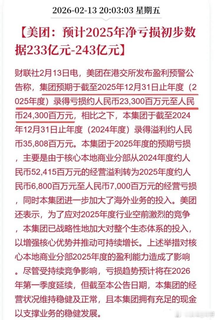 最新消息,美团年报预亏超230亿,美团2025年的业绩“变脸”引发全网热议。