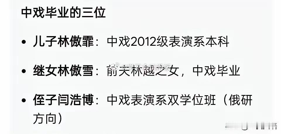 闫学晶冲上热搜。其子林傲霏、继女林傲雪、侄子闫浩博三人均就读/毕业于中戏,引发升学特权质疑。 闫学晶曾称儿子靠“新疆班”低分入学,中戏辟谣2012年无新疆班,称其为正常录取,说法矛盾引发入学合规争议,网友还爆料冒名顶替、艺考泄题举报。 中戏表演系原主任陈刚、现任主任王鑫接连投案,二人曾分管招生,陈刚恰是林傲霏当年所在院系原主任,时间线高度重合,舆论将两者关联。 目前官方未公布具体涉案原因,暂无直接证据指向闫学晶亲属;中戏澄清合规但未公示分数与名单,公众质疑未消,引发对教育公平的热议。