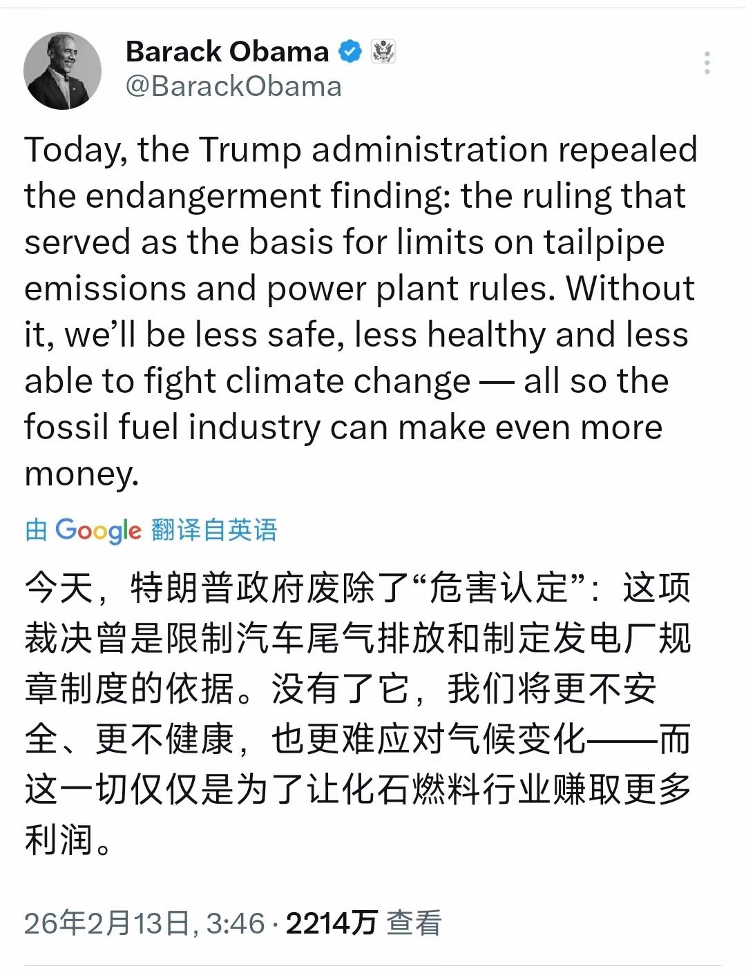 特朗普下令对委内瑞拉动武并让美军抓捕马杜罗夫妇,奥巴马没有公开发声; 特朗普扬言吞并格陵兰岛,奥巴马也没有公开发声; 为什么特朗普在2月12日刚宣布正式撤销2009年EPA“温室气体危害认定”,奥巴马就在13日迅速发声了? 答案很简单,因为2009年EPA“温室气体危害认定”,是奥巴马任内核心政策之一,可以说是奥巴马拿得出手的一份政治遗产! 所以,都是千年的聊斋,各披着一张漂亮的“画皮”罢了。
