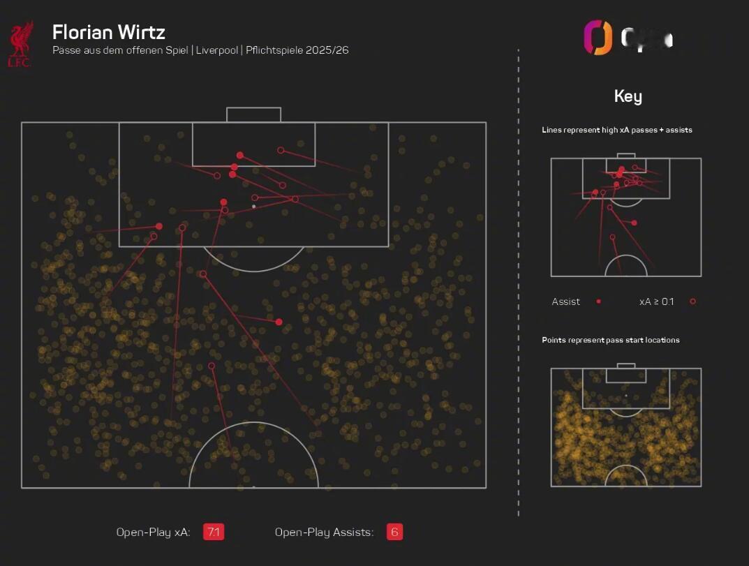 根据OptaFranz的统计,维尔茨本赛季在各项赛事中已经创造了66次运动战机会,这在欧洲五大联赛中,只有亚马尔(80次)、姆巴佩(79次)和奥利塞(68次)的这项数据超过了他。
