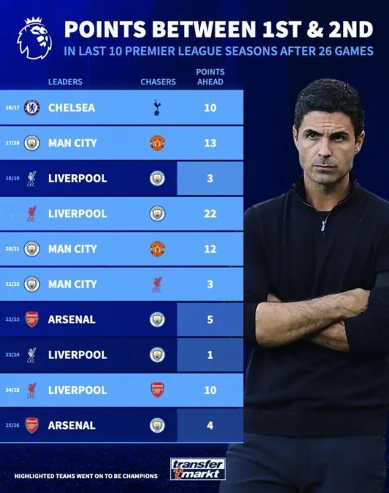 德转盘点了过去10个英超赛季,在26轮比赛后领先者与追赶者之间的积分差距,并标出最终成为冠军的球队。