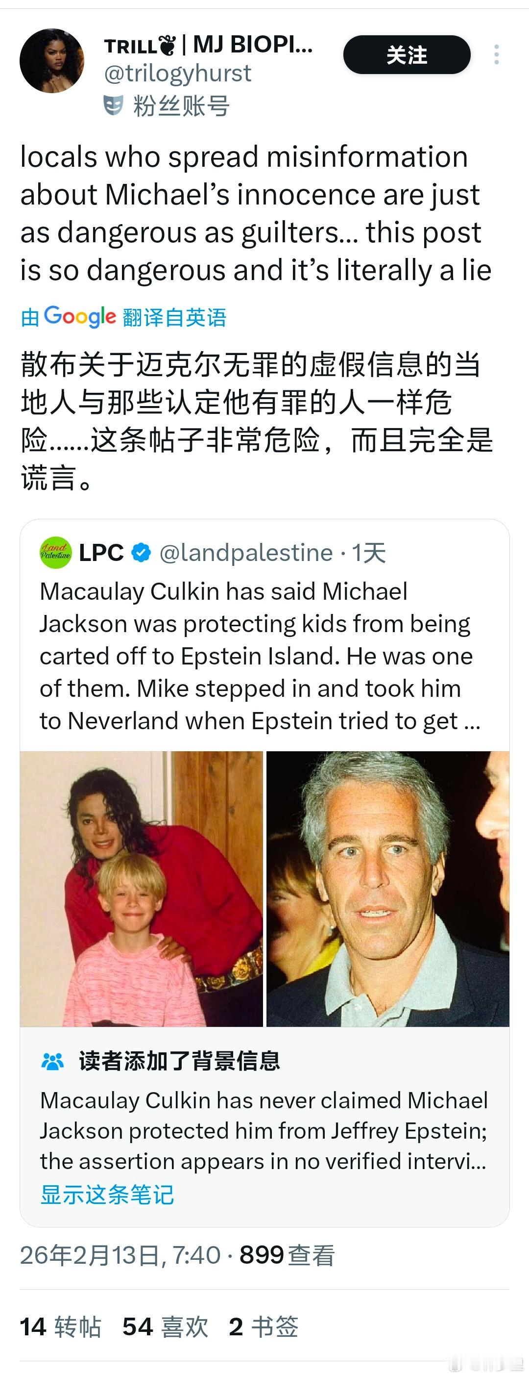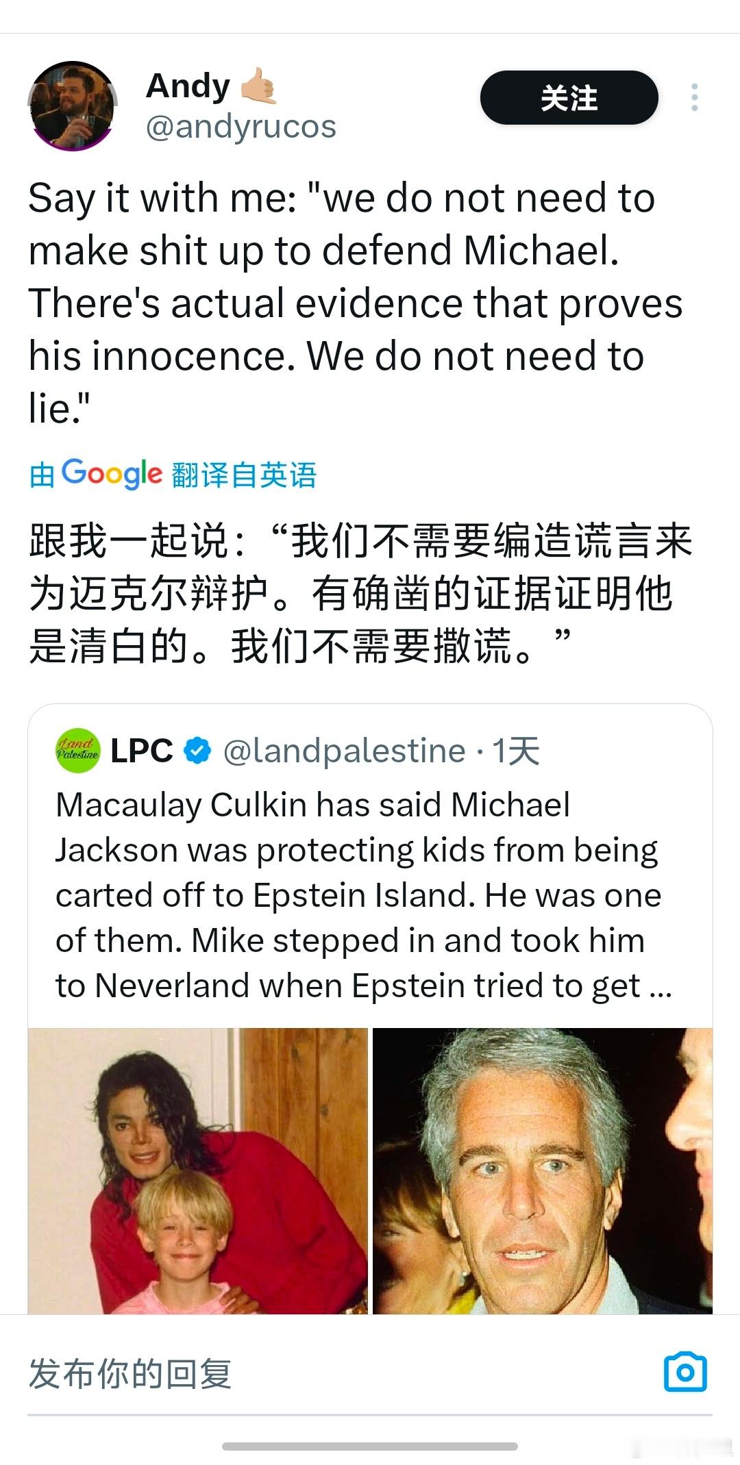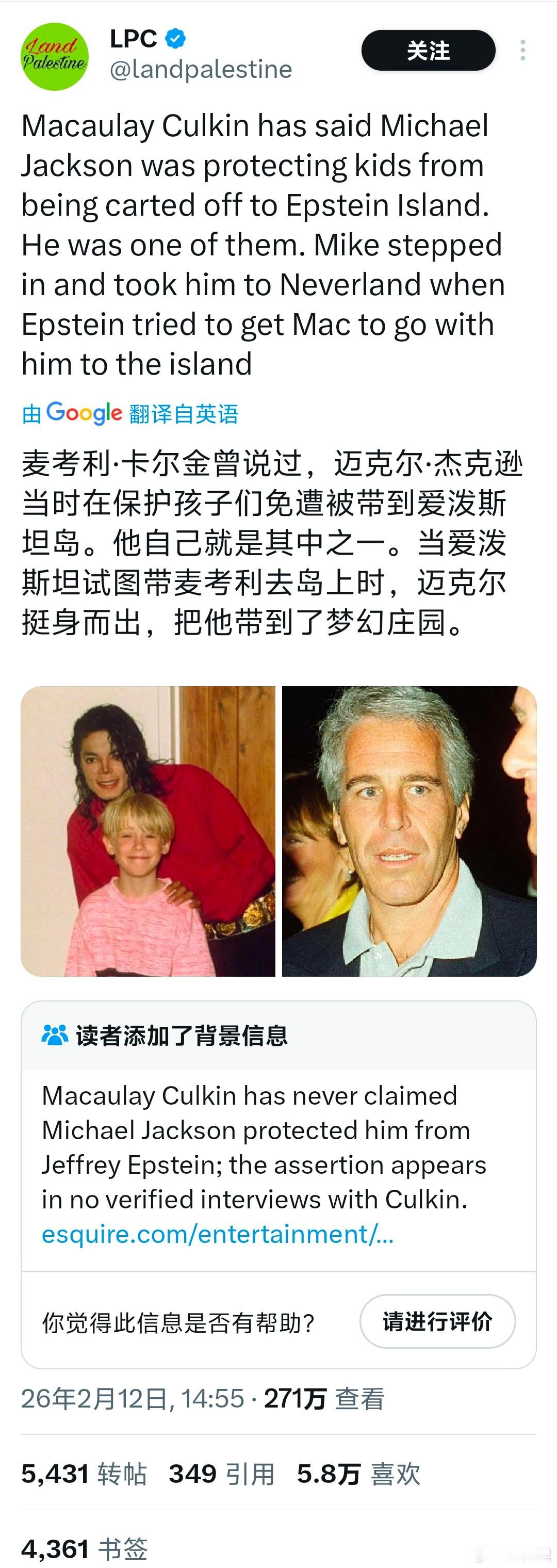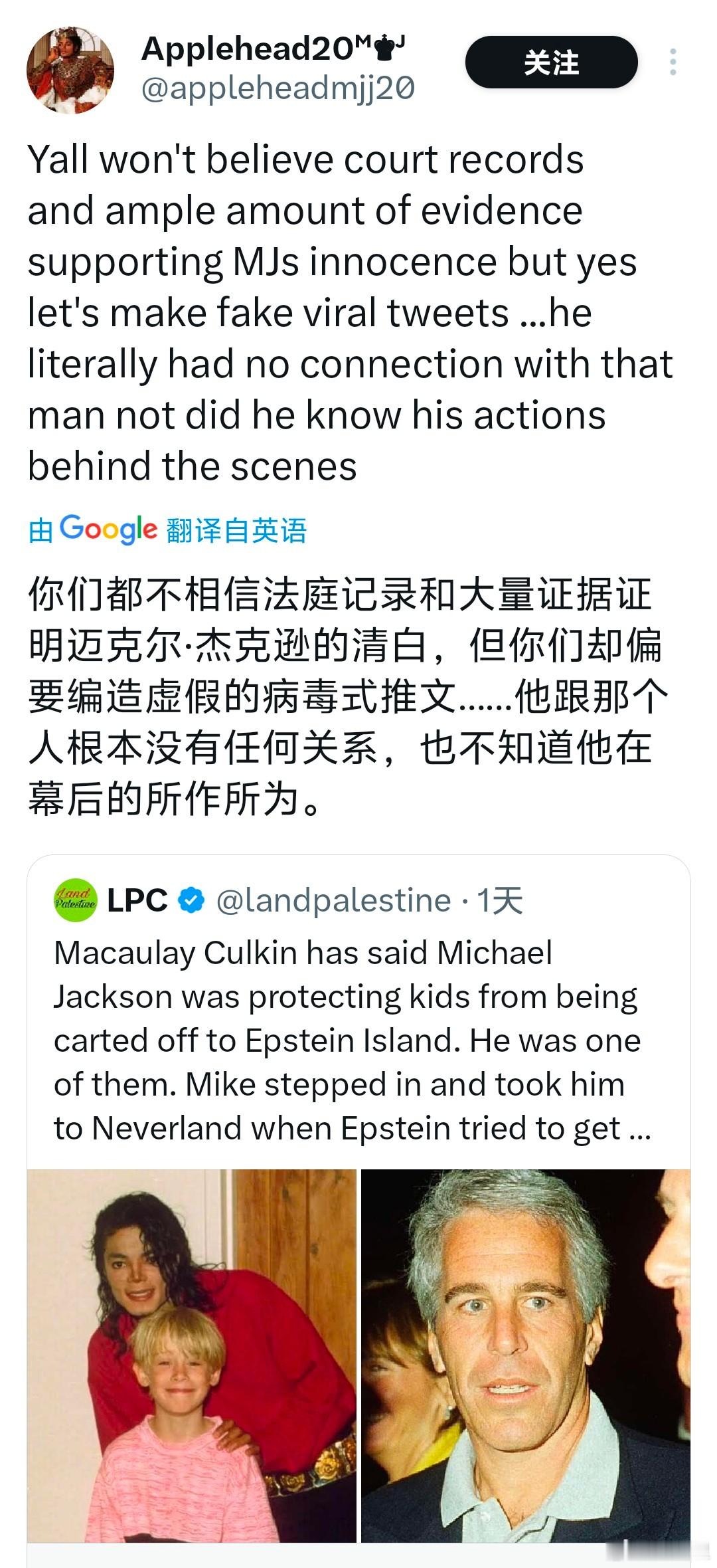 最近外网一条疯传的推文,说当爱泼斯坦试图带小鬼当家的麦考利去岛上时,迈克尔杰克逊挺身而出,把他带到了梦幻庄园。