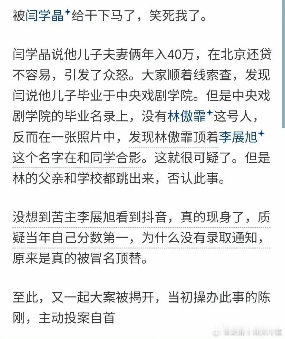 中戏这事让我想起了女演员郭柯宇,郭柯宇14岁就因为气质出众被章家瑞导演邀请出演了电视剧女主,18岁就因为主演电影《红樱桃》接连获得百花奖、上海国际电影节、平壤国际电影节三项电影大奖的最佳女演员。 然而,素人背景的她,即使拥有这么显赫的成绩,在报考北影时依然没被录取,已经经历过观众考验的她还是没能打动艺术院校老师,即使这些老师大部分地方成绩都没她好。 中戏、北影这些艺术院校对招生的自由裁量权太大了,行不行她们说了就算,这样就导致这些院校的专业测试的主观性就非常大了,一句话就能决定考生命运。 这种前提之下,能操作的地方就多了去了,就能解释为什么闫学晶家三个孩子能轻易考进拿过最佳女主角都不一定进得了的艺术院校,就能解释中戏老师出这么大事了。 假如有关部门放开了查这些艺术院校,不知道有几个人能过关?