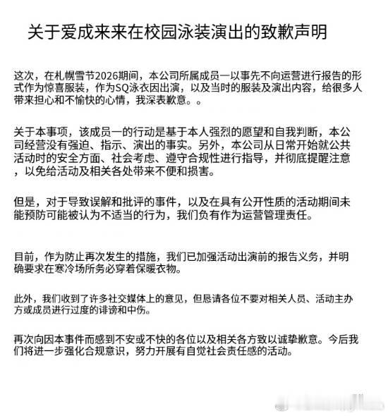 日本女团冰天雪地里穿泳装表演 公司事后还拍卖其泳装受强烈寒流影响,日本多地持续降雪,北海道更是出现零下低温。在此背景下,日本地下偶像女团 Planck Stars 近日受邀登上札幌雪祭舞台,成员在严寒中却穿着“死库水” 表演,期间甚至手持冰淇淋与观众互动。相关画面迅速在社交平台疯传,引发日本网络舆论强烈反弹。对此经纪公司回应称该行为是成员"出于本人强烈的愿望和自主判断",否认强迫表演。大量日本网民质疑声明真实性,批评经纪公司为制造噱头牺牲成员健康,直指此举是"变相虐待"和行业压榨。随着争议持续发酵,经纪公司又紧急发布致歉声明。称该造型原本是为粉丝准备的“惊喜”,因此未事先告知活动主办方,并呼吁外界避免对相关人员、主办单位及成员个人进行过度攻击。更骚的是,随后公司又发声明,称为了避免“雪地泳装表演”事件再发生,决定拍卖出售该件泳装,还特意标明了已清洗……
