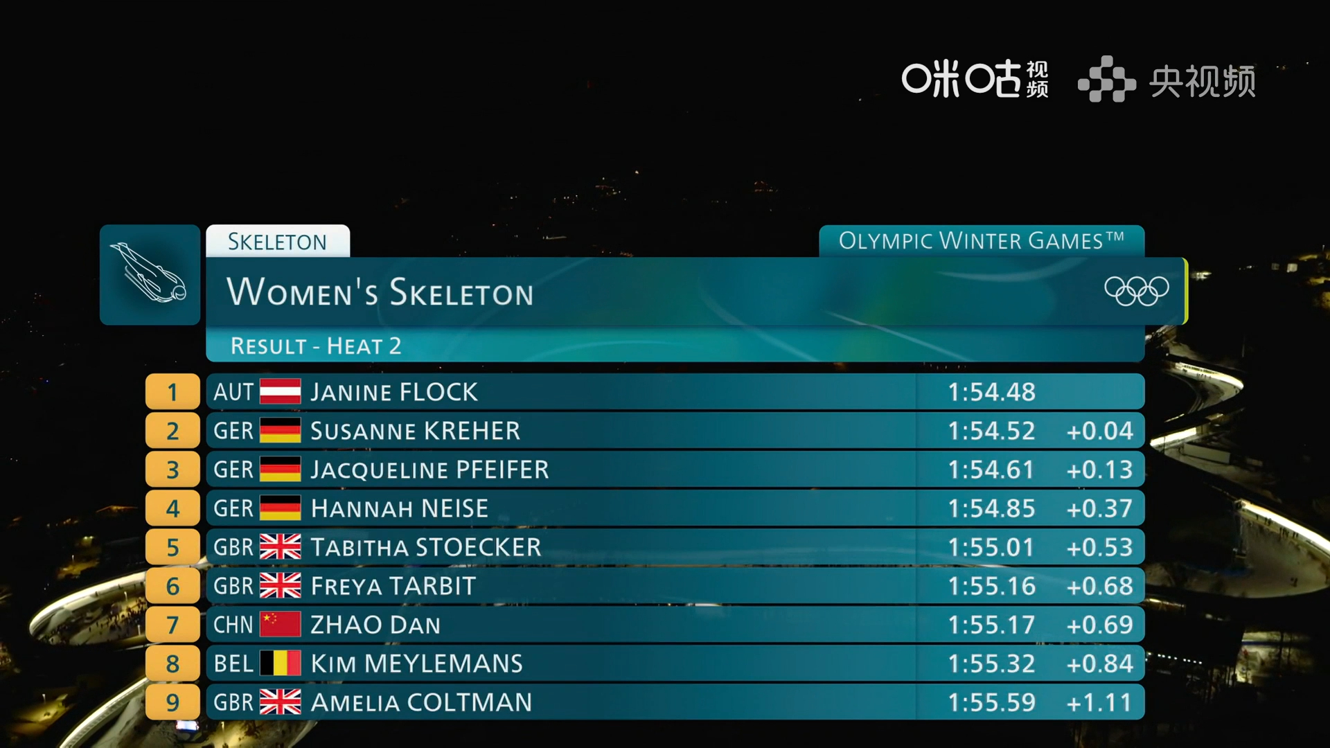米兰冬奥会钢架雪车女子组,🇨🇳赵丹,第一滑:57.70秒,第二滑成绩:57.47秒,两轮总时长:1分55秒17,排名暂列第7。