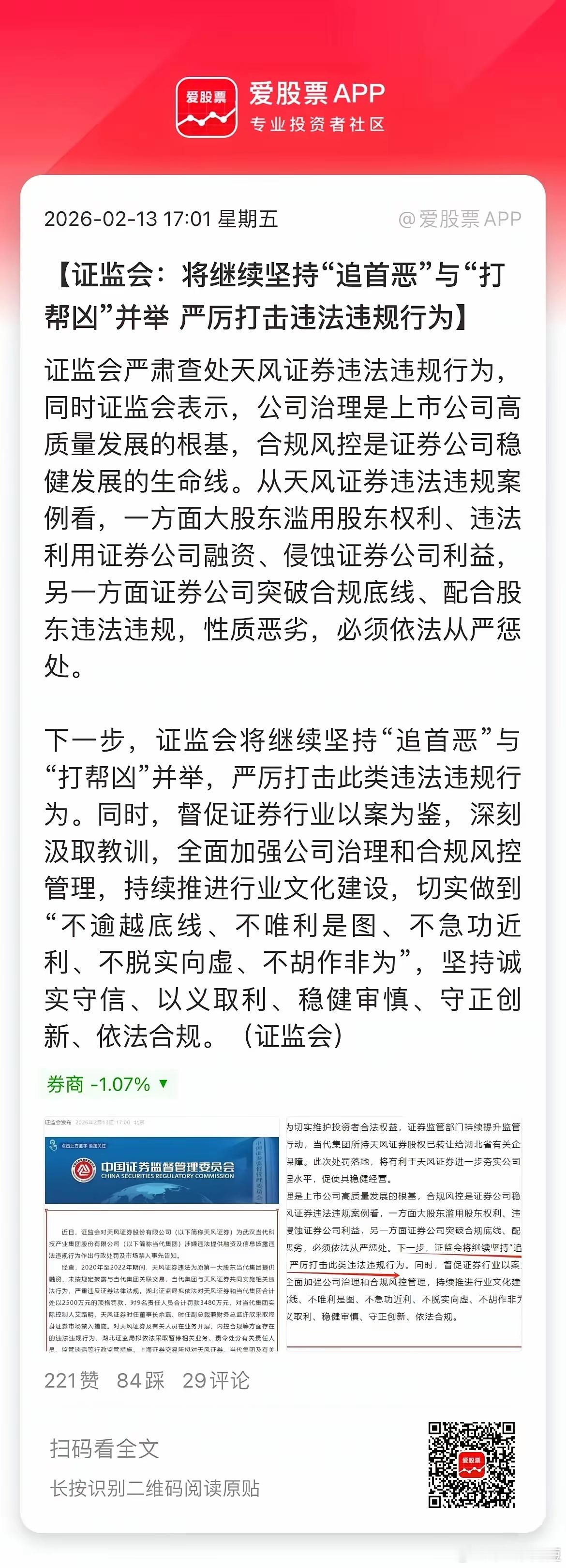 盘后村里又重拳出击了,打击市场各种违法犯罪!1、天风证券因信披违规涉嫌违法,收到证监会立案告知书,并2500万元顶格罚款。2、正元智慧:实控人陈坚犯操纵证券市场罪 被判处有期徒刑三年。3、创识科技:控股股东、实控人张更生犯单位行贿罪 被判处有期徒刑二年。4、嘉麟杰:实控人李兆廷被公安局执行拘留。5、在互动平台“自问自答” 英集芯被证监会立案调查。总之,罚款的罚款,拘留的拘留,抓人的抓人,立案调查的立案调查。最奇葩的是英集芯在互动平台“自问自答” ,这个都能被村里揪出来,真挺逗的!小a去看了下,该公司主要吹自己涉足脑机接口领域,还说自己芯片已经量产出货。A股确实喜欢炒这些蹭概念的,这一年股价涨得还挺猛的。