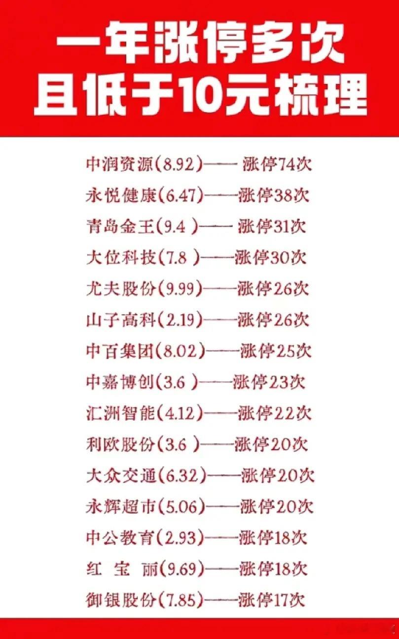 一年涨停多次且低于10元个股梳理A股市场从不缺妖股,有些低价股更是涨停常客,爆发力惊人!过去一年股价低于10元,且全年涨停次数≥17次的公司名单出炉,从74次到17次不等,每一次涨停都暗藏市场情绪与资金动向。中润资源:2024-2025年因国资入主预期、黄金主业转型、摘帽预期等多重利好,全年涨停74次,成为市场关注度极高的“妖股”。大位科技:2024-2025年因AI算力概念、东数西算政策、国资入主预期、资产处置溢价等多重催化,全年涨停30次,成为市场情绪与资金博弈的核心标的。⚠️ 注:涨停次数≠投资价值,仅作数据参考,不构成任何投资建议。理财有风险,投资需谨慎。