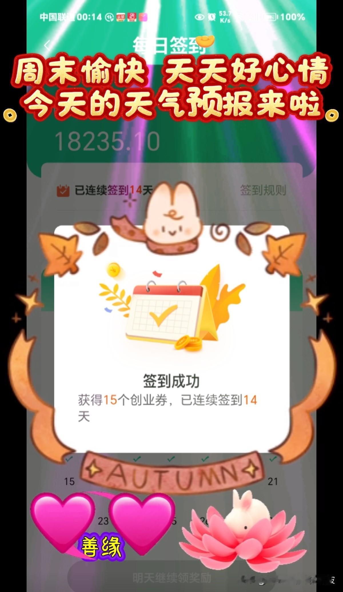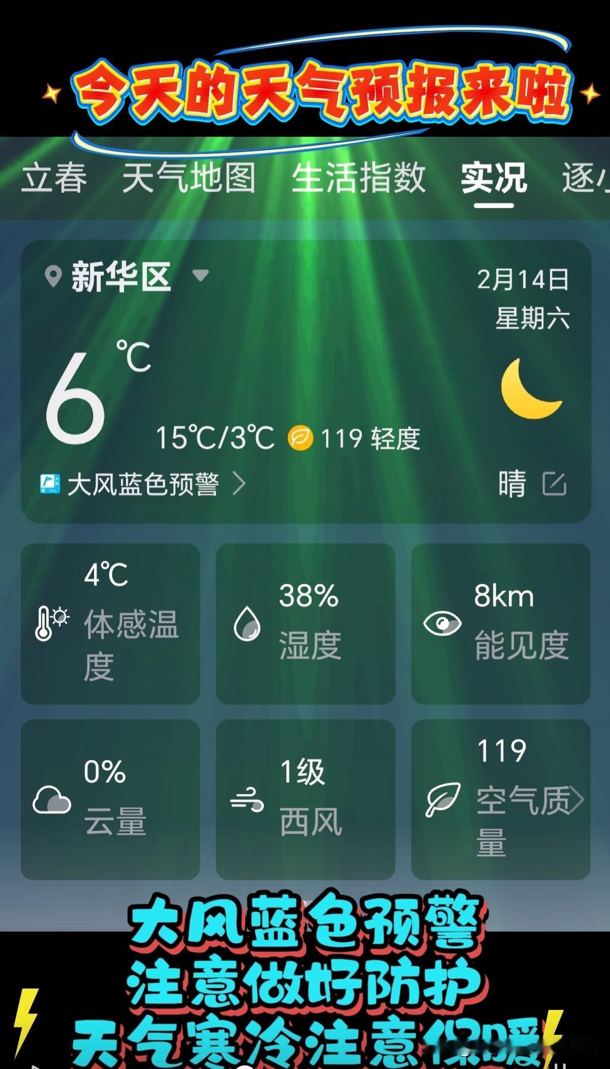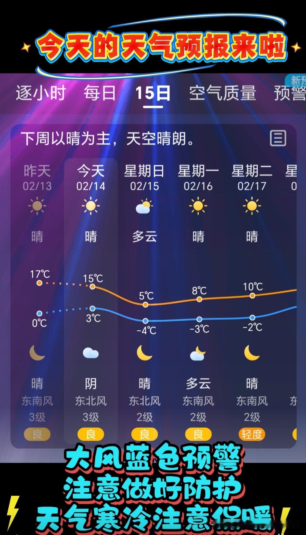 🌻早安问候🌻 𝙂𝙤𝙤𝙙 𝙈𝙤𝙧𝙣𝙞𝙣𝙜 今天是: 2026年2月14日 星期六 农历:乙巳年腊月二十七 周末到啦!喜乐常伴,万事顺心! 签到成功,获得15个创业卷,已连续签到14天! 👉今日天气: 晴转阴,当前晴朗,下周以晴为主。 👉大风蓝色预警 👉空气质量: 轻度污染 除少数对某些污染物特别容易过敏的人群外,其他人群可以正常进行室外活动。 👉气温:15℃~3℃ 昼夜温差12度,人体感觉寒冷,极不适应,注意保暖防寒,防止冻伤。 👉湿度:38% 👉风向:东北风 👉风力:3级 👉紫外线:1级,最弱紫外线辐射天气,无需特别防护。若长期在户外,建议涂擦SPF在8-12之间的防晒护肤品。 👉日出:7:14 👉日落:17:59 ꧁ 🍄꧂ 🌷🌴🍒 春在前方,年在路上。 不负周末好时光。 愿我们 日日有喜,岁岁无忧,快乐天天拥有,健康相伴久久,幸福日复一日,顺心年年都有,每天阳光灿烂,一生平安富有。 ʚ🌻ɞ早安☕️