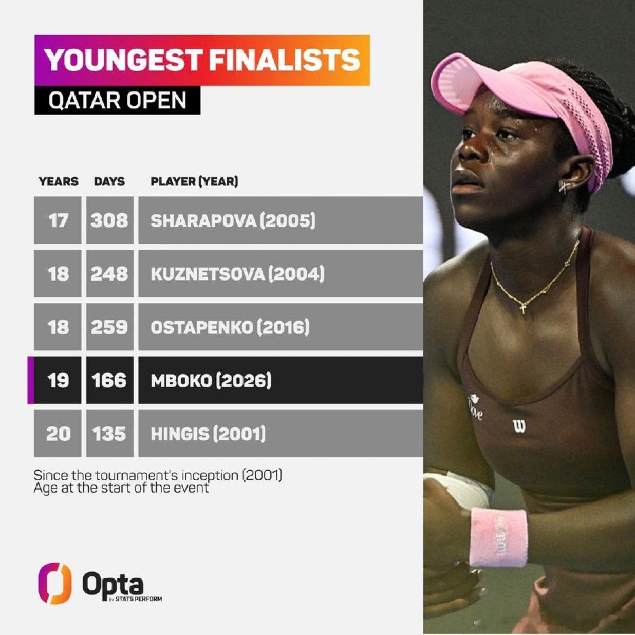 2️⃣4-姆博科是多哈赛历史上第四年轻的决赛选手,上榜的另外四人都是大满贯冠军;17岁308天的莎拉波娃🇷🇺(2005)18岁248天的库兹涅佐娃🇷🇺(2004)18岁259天的奥斯塔彭科🇱🇻(2016)19岁166天的姆博科🇨🇦🆕(2026)20岁135天的海宁🇧🇪(2001)