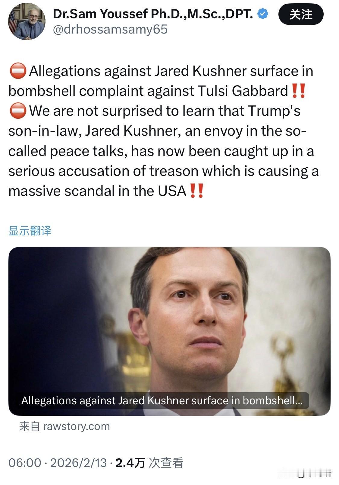 根据 2026 年 2 月的最新消息,贾里德·库什纳(Jared Kushner)成为了针对国家情报总监(DNI)图尔西·加巴德(Tulsi Gabbard)的一份机密吹哨人投诉的核心人物。以下是该事件的详细情况: 核心指控与事件背景 截获的通信:该投诉源于 2025 年春季被外国情报机构截获的一段两名外国人之间的对话,对话中提到了库什纳。据《纽约时报》报道,对话参与者暗示库什纳是影响未来中东和平谈判的理想接触人选。 针对加巴德的指控:吹哨人指控加巴德出于政治目的,在过去八个月里一直阻止或限制该机密报告在情报部门及国会之间的分发,该报告甚至曾被锁在保险箱内。 涉及库什纳的争议:虽然有报道称对话内容涉及针对库什纳的“重大”指控,但目前尚无确凿证据支持这些说法。特朗普政府的高级官员已明确否认相关指控,称其为“被证明是虚假的”谣言。 目前的局势 国会介入:在延迟数月后,一份经过高度删减的投诉文本已于 2026 年 2 月初提交给国会。美国参议院情报委员会(如参议员马克·华纳)已对此表达了强烈不满,并要求加巴德解释为何延迟提交。 潜在风险:尽管目前尚未有官方定论库什纳涉及“叛国”,但该事件已引发关于其可能违反《外国代理人登记法》(FARA)的广泛讨论。 目前,该事件在华盛顿引起了巨大反响,被视为对加巴德领导下的情报机构透明度的重大考验。