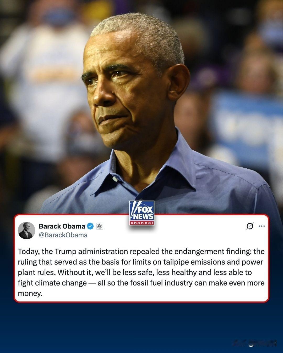 前总统奥巴马在特朗普政府废除 2009 年美国环保署的“危害认定”后发出警告,该认定启动了大多数针对新车和发电厂的气体排放标准: “我们会变得更不安全、更不健康,也更无力应对气候变化——这一切都是为了让化石燃料行业赚更多的钱。”