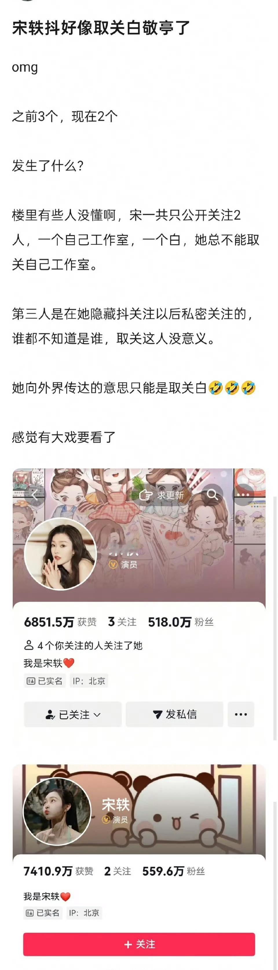 猜测应该是取关了白敬亭 网友认为:宋轶一共只公开关注2人,一个自己工作室,一个白,她总不能取关自己工作室。 第三人是在她隐藏抖关注以后私密关注的,谁都不知道是谁,取关这人没意义。 她向外界传达的意思只能是取关白敬亭 搞不懂她最近这些操作了 像在宣誓主权又像恢复单身