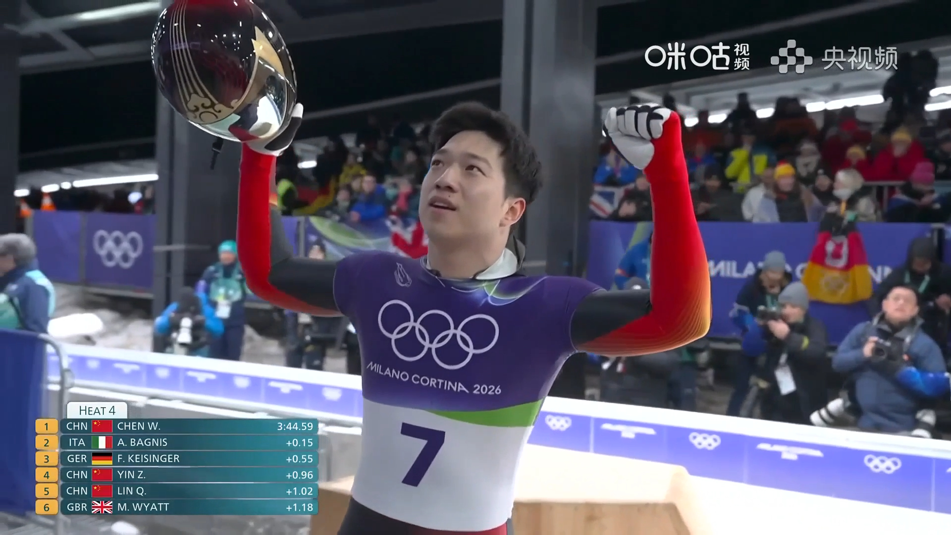 米兰冬奥会男子钢架雪车,陈文浩以四轮总时长3分44分59,排名第4;殷正以四轮总时长3分45秒55,排名第7;林勤炜以四轮总时长3分45秒61,排名第8。