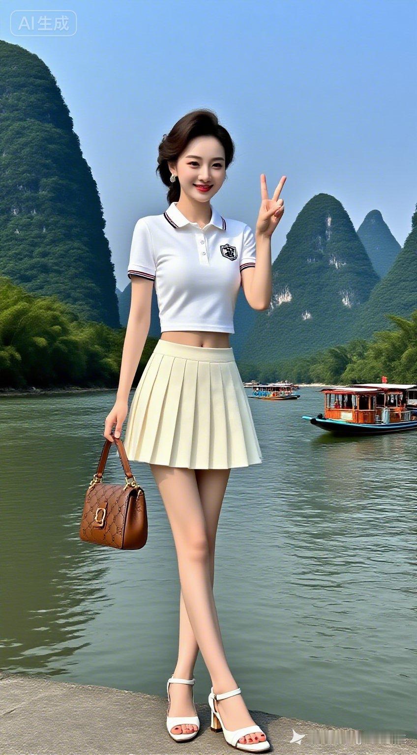 绝色女子身着带图案白色紧身短款衫、米白短百褶裙,沙漏身材曲线曼妙,长腿纤细,脚踩白色高跟一字凉鞋,斜挎棕色品牌包。于桂林山水前比出剪刀手,漓江游船与喀斯特峰林相映,青春活力满溢,尽显旅行愉悦。
