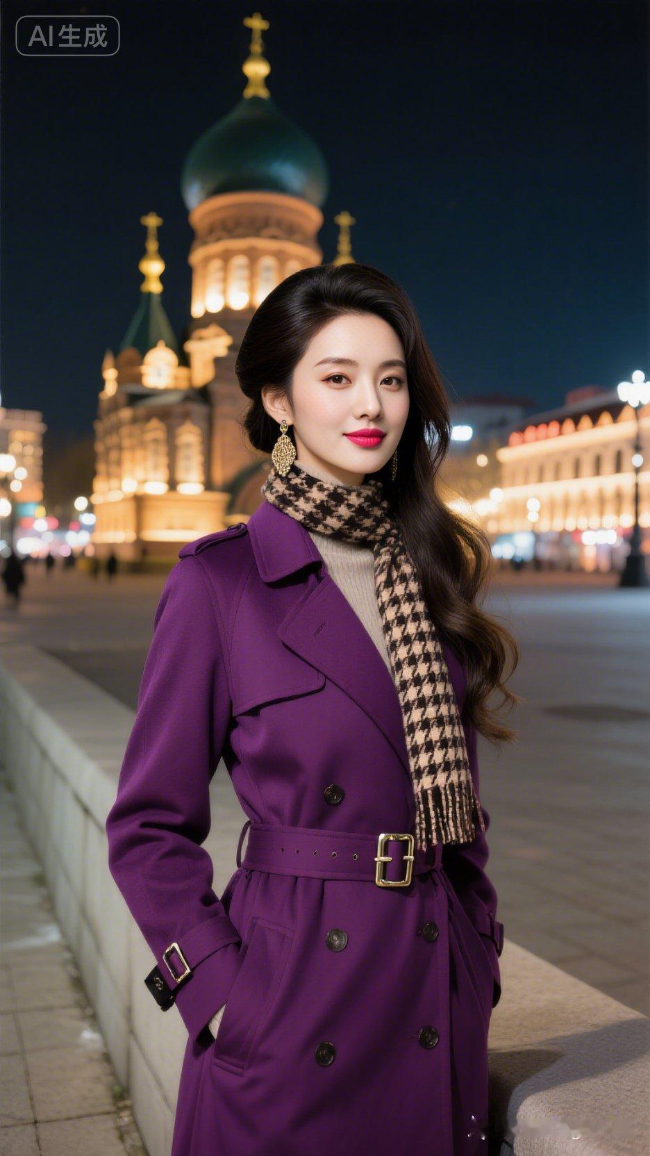 夜色里哈尔滨索菲亚大教堂灯火璀璨,女士身着紫红色风衣,配千鸟格围巾、金属扣腰带与贝雷帽,长卷发随风轻扬,鞋履呼应穿搭,静立广场一侧,姿态高贵典雅,远景镜头氛围感十足。