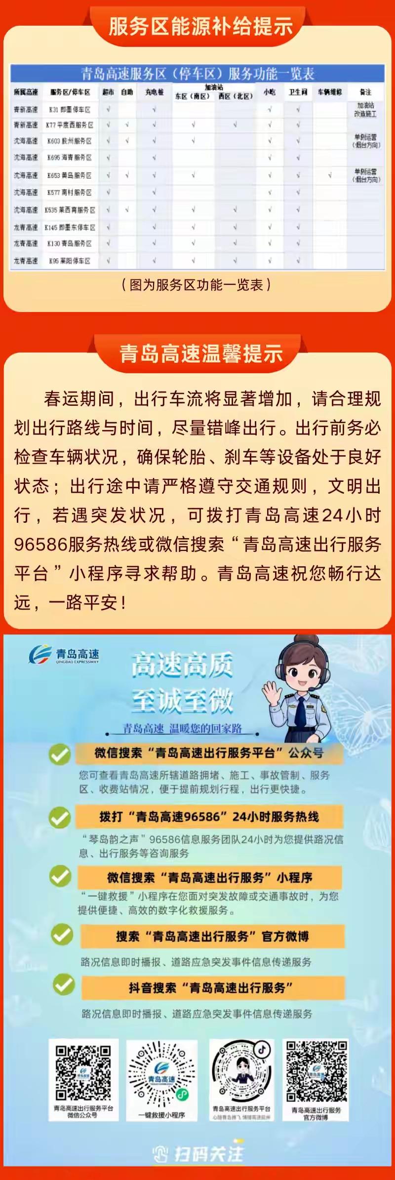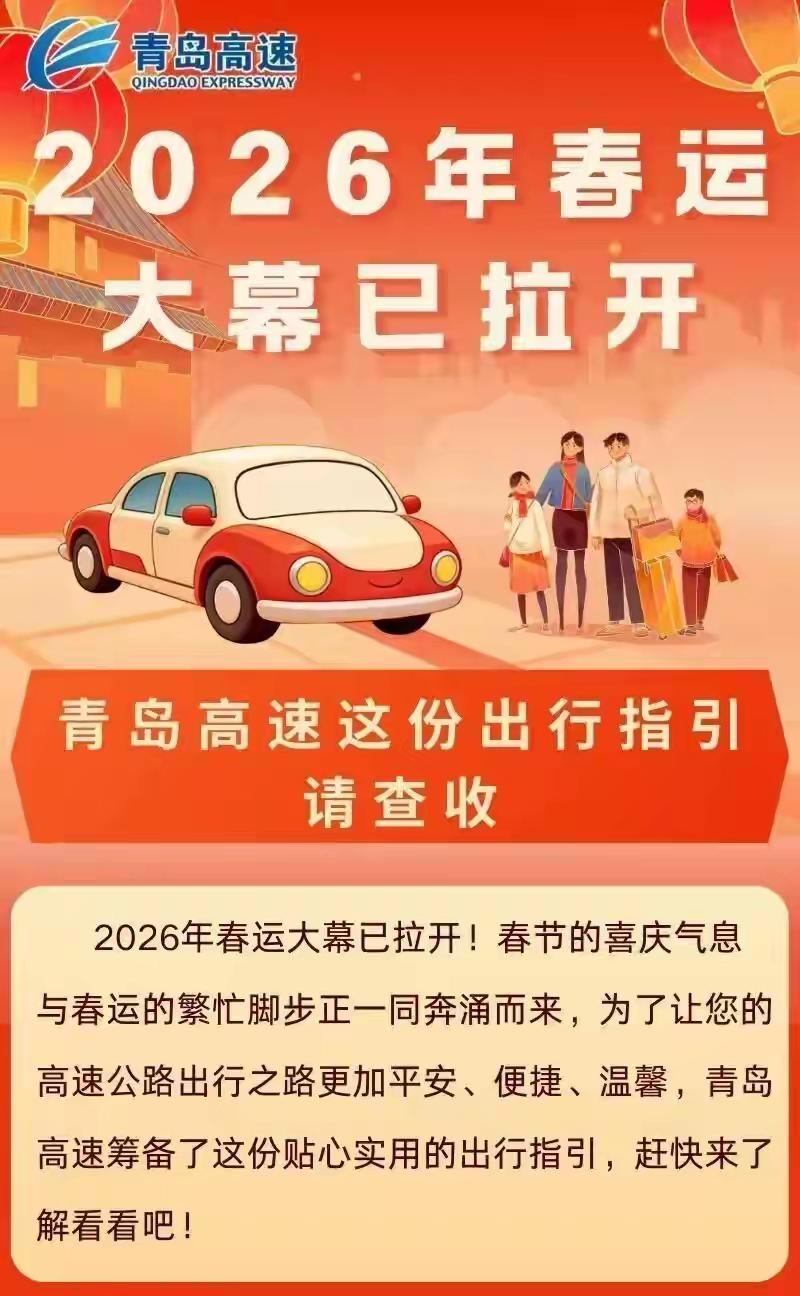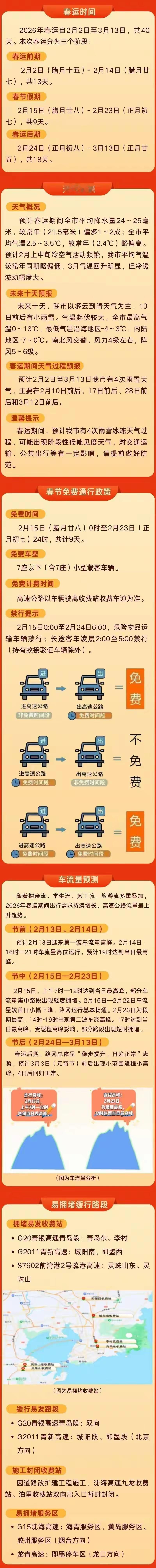 青岛车主注意!2026春节高速避堵全攻略:这9天免费但这几条路千万别走,附实时救命热线! 当行李箱轮子摩擦地面的声音再次响起,我们知道,一场跨越山海的家宴即将开席。2026年春运大幕已然拉开,青岛境内高速路网即将迎来一年中最汹涌的“归心”车流。这W不仅仅是一次出行,更是千万游子与故乡之间最深情的奔赴。 然而,团圆的路途常常伴随着拥堵的焦灼。根据预测,节前出行最高峰将出现在2月13日至14日,尤其是晚高峰时段,青银高速青岛段等主干道将承受巨大压力。想象一下,当车载音乐播放着《常回家看看》,眼前却是望不到头的红色尾灯,那份归心似箭该如何安放? 智慧出行,始于规划。今年春节,小型客车免费通行时间为2月15日0时至2月23日24时,整整9天。但请切记,免费时间以车辆驶离出口收费车道为准。这意味着,你可以提前驶入高速,只要在免费时段内驶出即可。这小小的技巧,或许能帮你避开最后时刻的收费站拥堵长龙。 除了时间,空间上的选择更为关键。G2011青新高速城阳至即墨段、沈海高速部分服务区等都是传统的“堵点”。今年,因施工影响,沈海高速九龙、泊里收费站双向封闭,务必提前绕行。真正的聪明车主,早已学会利用“青岛高速出行服务平台”小程序,实时查看路况,动态调整路线。 天气,是春运路上最不可控的变量。据预报,春运期间青岛冷暖波动大,2月10日前后及月底可能出现雨雪天气。当团圆遇上风雪,安全便重过一切。出发前,请花五分钟检查轮胎花纹和刹车性能,这份谨慎,是对家人最好的新年礼物。 倘若真的在途中遭遇突发状况,请记住,你并非孤身一人。青岛高速96586服务热线24小时守候,微信小程序内“一键救援”功能能快速定位你的求助。科技的温度,就在于让每一声呼唤都能得到回响。 每一盏被点亮的车灯,都是指向团圆的箭头。我们理解你方向盘后的急切,也懂得你后备箱里满载的思念。正因如此,这份指南才不止于指南,它是一份来自城市的守护承诺,愿用最详尽的准备,换你每一程的平安顺遂。 路虽远,行则将至;家虽遥,心已抵达。当你终于风尘仆仆地推开家门,那一刻,所有的奔波都化为值得。青岛高速,愿守护你的每一次出发,更护航你的每一次抵达。 (来源:综合自青岛高速集团官方出行指南、山东省交通运输监测与应急处置中心及气象部门预报) 春运路况 平安回家