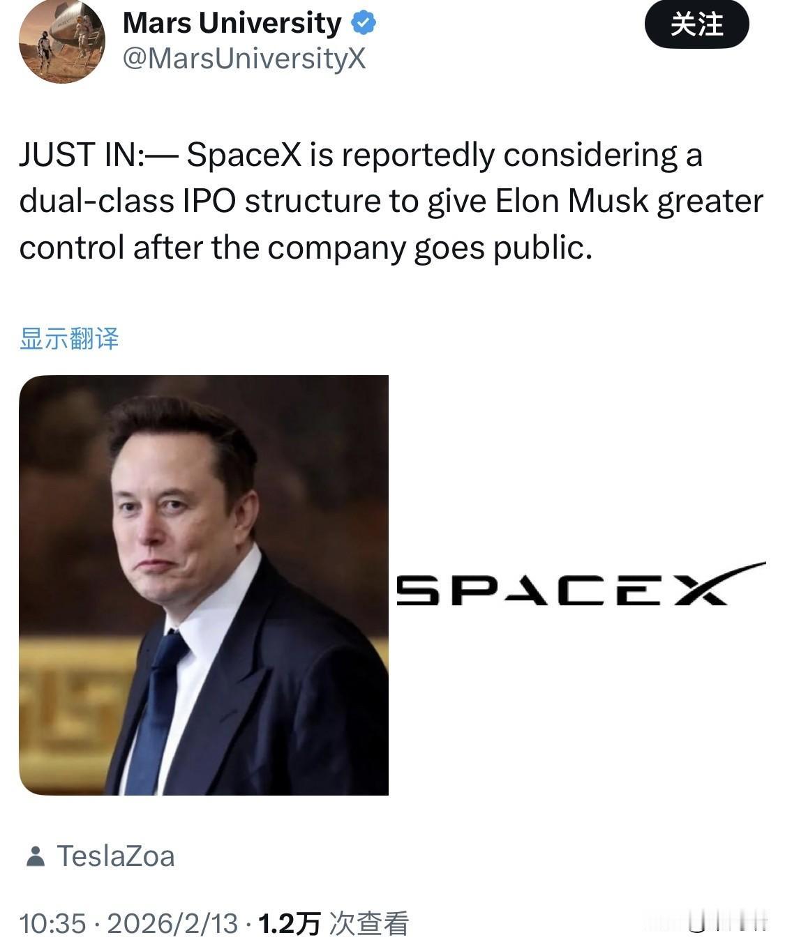 根据 2026 年 2 月 13 日的最新报道,SpaceX 正考虑在计划于今年进行的首次公开募股 (IPO) 中采用双重股权结构。这一举措旨在确保埃隆·马斯克在公司上市后即便持有少数股权,仍能拥有“超级投票权”以维持对公司的绝对控制。 以下是目前已披露的关键细节: 核心目的: 仿效 Meta 和 Alphabet 等科技巨头的模式,通过赋予创始人每股 10 票或 20 票的投票权,抵御激进投资者并使其专注于长期愿景。 估值与规模: 据 彭博社 (Bloomberg) 报道,SpaceX 的 IPO 目标估值可能超过 1.5 万亿美元,融资规模或高达 500 亿美元,有望创下全球最大 IPO 纪录。 资金用途: 募集资金将用于支持雄心勃勃的扩张计划,包括在太空建立 AI 数据中心、建设月球工厂以及开发抵达火星的星舰系统。 上市时间: 马斯克曾暗示目标是在 2026 年上市,目前有消息称公司正积极推进,争取在今年下半年甚至早至 7 月前完成 IPO。 业务整合: SpaceX 最近已完成了对马斯克旗下 AI 创企 xAI 的收购,业务已从核心的火箭和卫星领域扩展至人工智能。 此外,SpaceX 正在增加董事会成员以协助指导 IPO 进程并监督公司向新业务领域的转型。