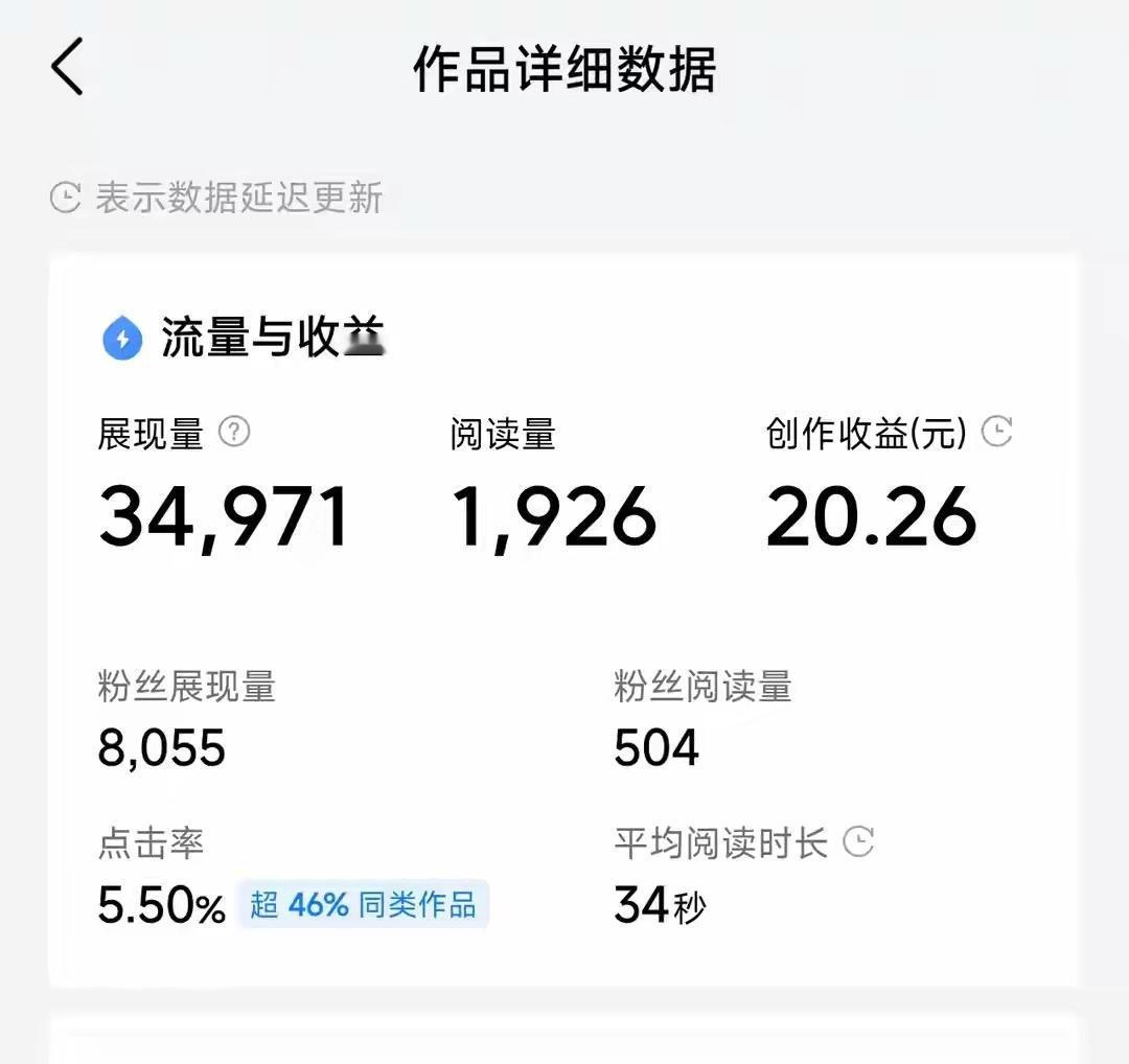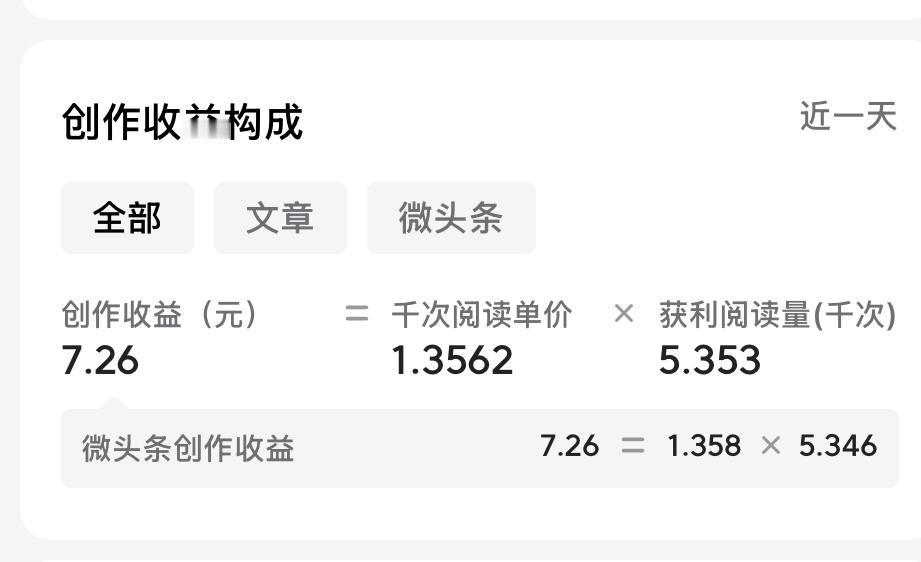 千次阅读单价终于翻倍了,果然这招管用! 从头条发文以来,我的阅读单价一直不高,始终在三两毛到七八毛之间徘徊。 原来以为头条上所有创作者都是这样,后来才发现还真的不是。 看到有许多头条创作者,阅读量虽然只有1000多,可收益却能达到10元甚至20元(见图一),而阅读量过万者,收益就能够达到100多元,原因就是千次阅读单价搞得鬼! 反观自己写出的东西,阅读单价太低,与人家相比差距太大了。 于是,我觉得既然写头条还真得研究一下“单价”这个问题,最起码也要知道差距在哪里? 我发现阅读单价高的作者,有几个共同的特点: 第一、粉丝量大 我看到的几位作品阅读单价高的作者,粉丝量都在七八万以上,有的甚至十万以上,这一点真学不来,具体都有谁来关注咱的账号,我们自己也说了不算。但粉丝阅读量与单价正相关,粉丝量越大,粉丝阅读量越高,粉丝阅读量高,单价就高这也是事实。 第二,字数较多 头条对于作品质量的评判,似乎发生了变化,现在更注重作品的深度,以前那种100多字的小作文口水文,似乎不太受待见了,而一些有深度的,有文字量的作品似乎更受青睐,文字量大,自然阅读时间长,阅读单价高。 第三,高价值输出和高垂直度 阅读单价高的账号还有一个特点,就是能够提供有价值的分析或者经验,对他人有帮助,为别人所学习和借鉴。比如,写优化账号经验分享的、写育儿经验、写炒股经验分消化的等等。 再有就是高垂直度,也就是账号发布的同领域作品,达到90 %以上。术业有专攻,作品垂直度高,有利于提高该领域的专业程度,这也是今日头条所倡导的。 有了上述认识,我首先从第二条也是最容的做起,有意识地增加了文字量,提高阅读时长,还是有了一定效果,最近阅读单价翻倍了,从原来的三四毛提高到了1.3块多(如图二)! 由于我这个账号起始时是生活类账号,后来才改成房产类,以至于垂直度不够,账号权重不高,所以,还达不到几元以上的单价。但我相信随着时间的推移,原有的生活类作品被消化,房产类作品比重上来后,单价就会再提高一些。 不知道友友们的阅读单价能到多少,是不是都很高?