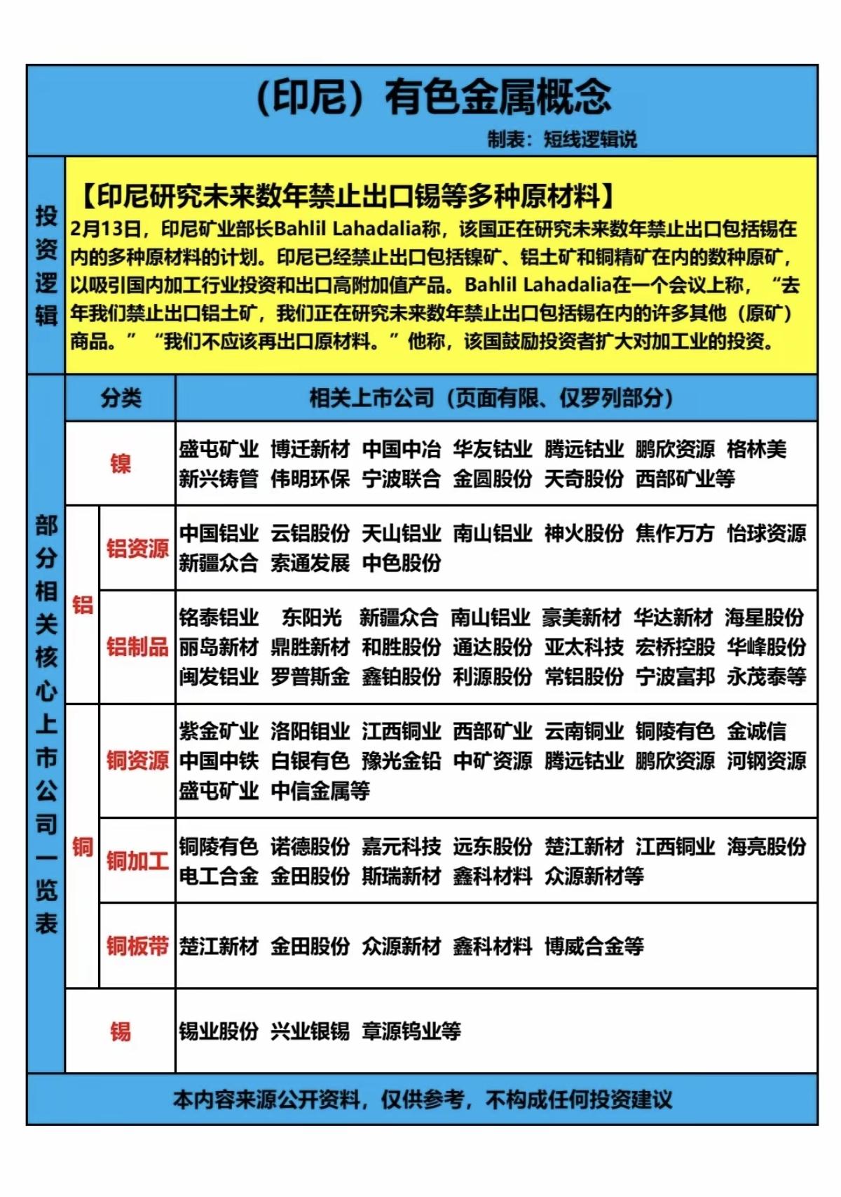 (印尼)有色金属概念! 印尼研究未来数年禁止出口锡等多种原材料! 主要包含:锡,镍,铜,铝。 相关核心龙头股: