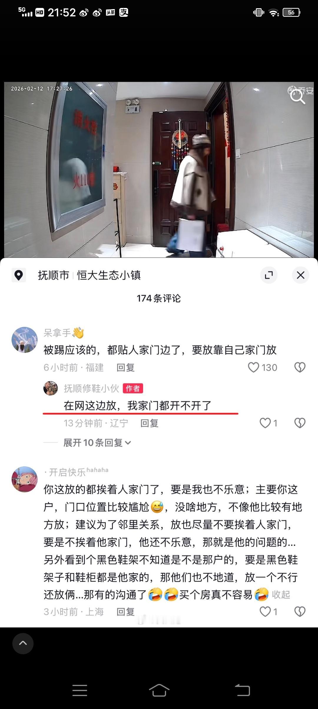 辽宁抚顺,某网红发视频吐槽:没素质的邻居踢我鞋柜,真不要脸…… 没想到网友压根不买账,纷纷对其进行指责:你都把鞋柜放在人家门口,人家不把你扔了算客气的了。 可大家不知道的是,就是这家邻居先把鞋柜放在公共通道上,而且多次沟通无果的情况之下,这位网红才以恶制恶的。 如此看来,大部分网友还是错怪了这个发视频吐槽的网红主播,这家人家有点太缺de,这个过道原本就小,还放个鞋柜。人可通过的地方就一块60公分地砖的空间,手里提点东西还要侧着身走。(大家请看图4) 大家觉得呢?
