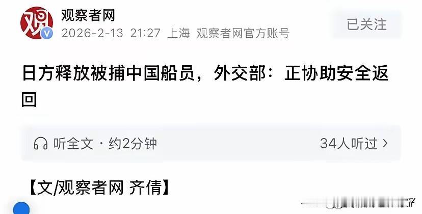 中国船长已获释,日本海保:警告日本渔民避免去钓鱼岛! ​​根据日本共同社消息报道,2月13晚间,日本水产厅宣布,此前被日本扣押的47岁中国船长获释。在提交保证金和书面担保后,这位船长正于中方驻日大使馆协助下踏上回国之路。 事情还得从2月12日说起,当日,日本水产厅在长崎县五岛市女岛西南约170公里海域,以“拒不服从停船命令、驾船逃逸”为由,扣押了中国渔船,船长当场被捕。 事发后,日本方面态度强硬,官木原稔、日本农林水产大臣铃木宪和纷纷表态,要竭尽全力查清事件,遏制外国渔船在其所谓“专属经济海域”的“非法捕鱼”活动,以保障日本“合法权利”。 那架势,仿佛要将此事“一查到底”,展现出一副“绝不姑息”的模样。然而,令人玩味的是,这边日本嘴上喊得凶,那边却悄悄有了不同动作。 在中方渔船被扣押后,日本海保竟第一时间通知日本渔业协会,让其提醒渔民尽量别去钓鱼岛附近海域捕鱼,以免惹上麻烦。这不是“嘴硬心软”吗? 一边宣称要强硬执法,一边却又担心引发更多问题,日本这“双面派”做法,实在让人啼笑皆非。日本此次以“非法捕鱼”为由扣押中国渔船,真的是为了维护渔业秩序吗?显然不是。 这更像是日本极右翼势力在拿下众议院后,为迎合国内反华情绪而进行的一次“政治冒险”。他们想通过这种方式,试探中方底线,看看中国会作何反应。 就如同一个“投机者”,想趁着混乱捞点“政治资本”,在国内树立“强硬形象”,殊不知这种行为是在“玩火”。此外,日本或许还打着另一个算盘,那就是逼迫中方打破对其“冷淡”态度,促使中日就双边关系展开对话。 但这种“以小博大”,拿中国渔民权益做筹码的做法,实在是不地道。中国渔民在东海传统渔场作业,是合理合法的,日方所谓“专属经济区”主张本就未得到中方承认,其单方面执法更是缺乏国际法依据,完全是“师出无名”。 好在中方反应迅速且强硬。事件发生后,外交部第一时间表态,坚决维护中国渔民合法权益,敦促日方遵守《中日渔业协定》,公正执法。中国驻福冈总领馆也迅速介入,为船员提供领事协助。 在中方的严正交涉下,日本最终选择释放船长,这无疑是中方维权的胜利。从过去类似事件的长期拉锯,到如今24小时内船长获释,背后是中国综合国力的提升,是中国对海外公民权益保障能力的增强。 日本此次“扣押 - 释放”中国船长的闹剧,虽暂告一段落,但给我们敲响了警钟。中国渔民在海外作业时,要增强风险防范意识,依法依规作业。 而日本也应明白,挑衅中国只会自食恶果,若想维护东海海域和平稳定与渔业秩序,就应恪守双边协定,摒弃挑衅行为,别再做这种“搬起石头砸自己脚”的蠢事。