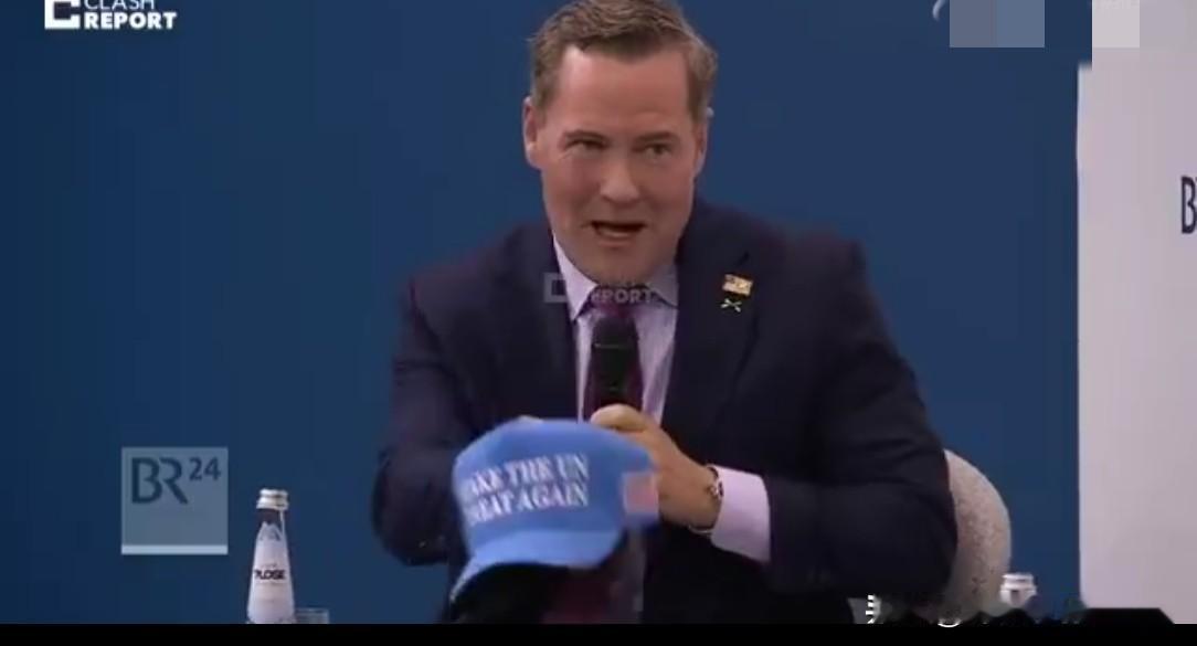 哇!有点意思! 美国常驻联合国特别代表迈克·沃尔茨带着他印有“让联合国再次伟大”字样的帽子出席了慕尼黑安全会议。 在我看来,这真是有样学样,他这肯定是受到了美国总统特朗普MAGA帽子的启发,所以,灵感一来赶紧搞了这么一顶帽子,作为出席慕尼黑安全会议的道具。 既然他口号喊得这么响,让“联合国再次伟大”,那我估计美国的意思是接下来要把联合国欠的总计超40多亿美元联合国会费交齐呗。[捂脸] 对吧,我判断这顶蓝色的帽子肯定是加班加点的从义乌商品城空运过去。