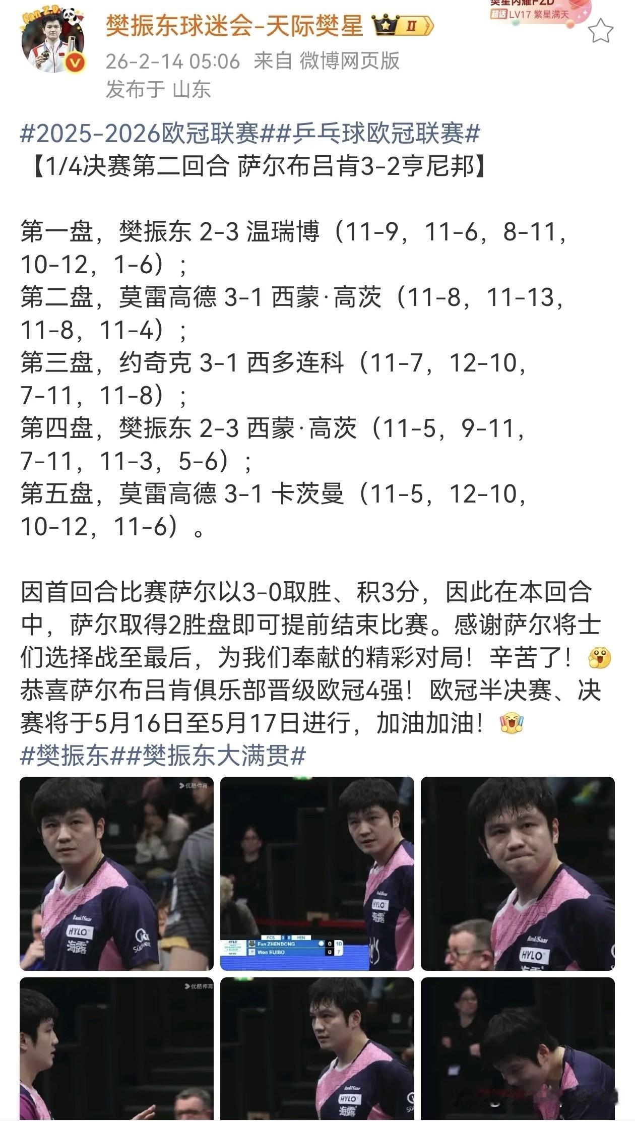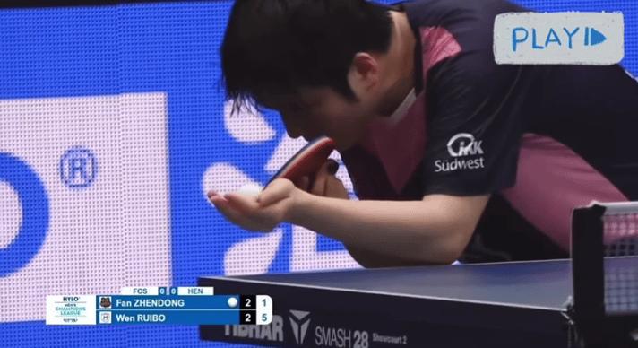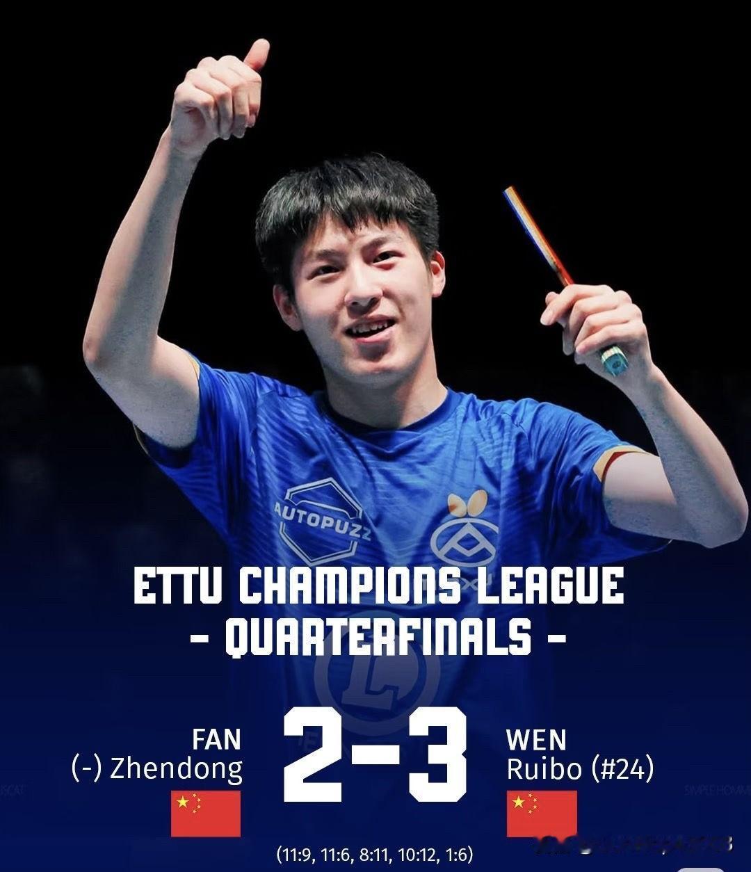 温瑞博3-2樊振东,欧冠联赛第五局6:1战胜樊振东。 欧冠联赛在今天早上5点的比赛,有樊振东和温瑞博参赛的两支队伍,进行了比赛, 最终樊振东参加的萨尔布吕肯战胜了温瑞博的队伍,晋级四强。 但是温瑞博和西蒙高茨都战胜了樊振东, 小温战胜了大哥哥,大比分0-2落后,逆转取胜,第五局的打法也很明显。 温瑞博结束了欧冠的比赛,就可以回国过年了了,然后准备明天的国际比赛。