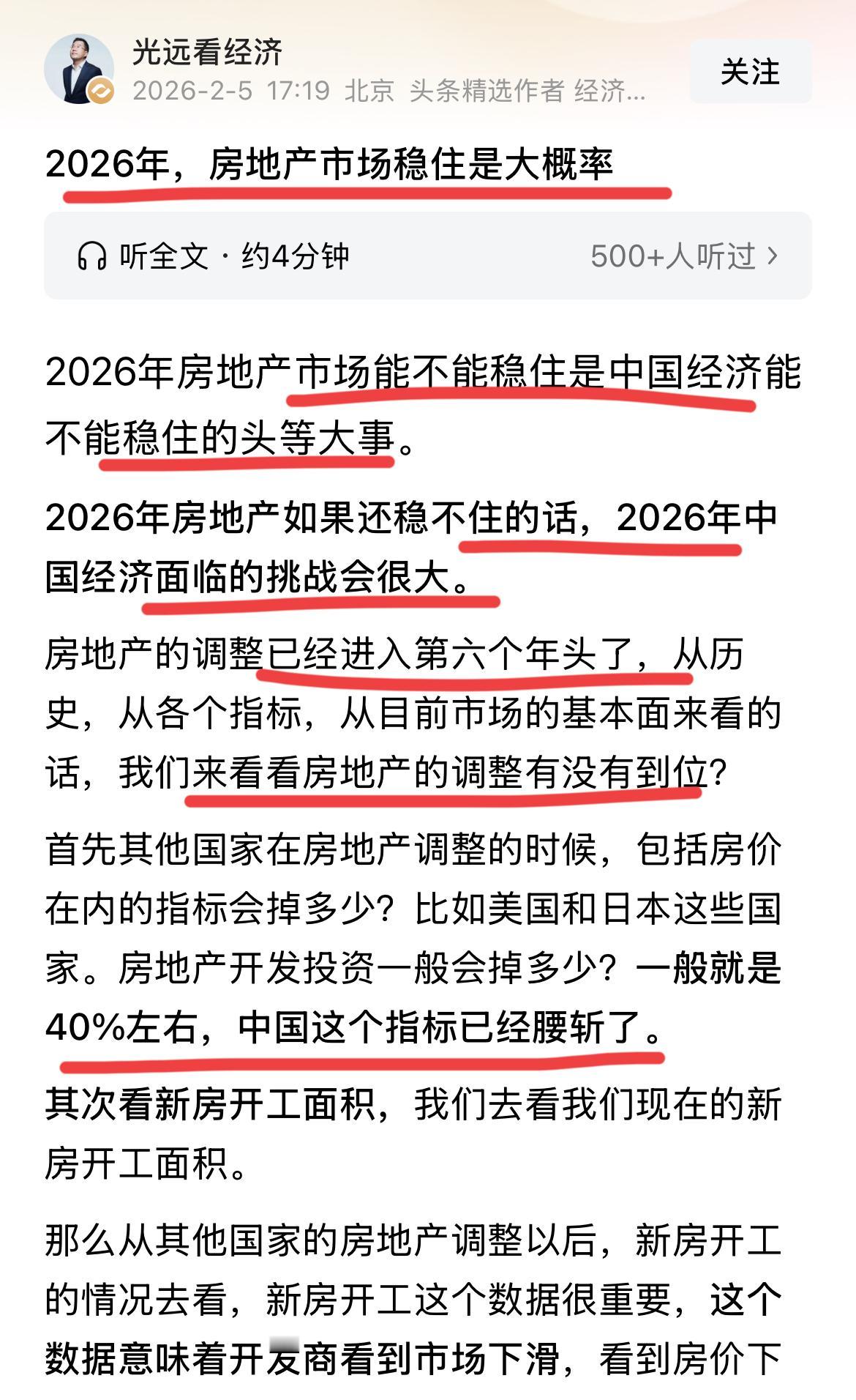 著名经济学家马老师再谈房地产! 2026年稳住房地产是大概率的事情~ 6年了,专家们对房地产市场的低迷,忧心忡忡,甚至是到了绞尽脑汁,食不甘味,夜不能寐的地步了!! 房价大幅下跌,已经跌入了40%,房地产开工建面积,房地产投资,都大幅下滑一半,甚至的一大半,这个时候,还不急吗? 专家称,这已经到底了,不客气地说,已经跌过头了,所以物极必反,否极泰来,已经到头,必定要稳定,逆转了~ 真的吗,又要开始上涨了吗? 专家都认为,房地产是周期之母,是经济支柱,如果房地产不恢复,想让经济恢复和振兴,难上加难!! 房地产要反弹了,你准备好了吗?
