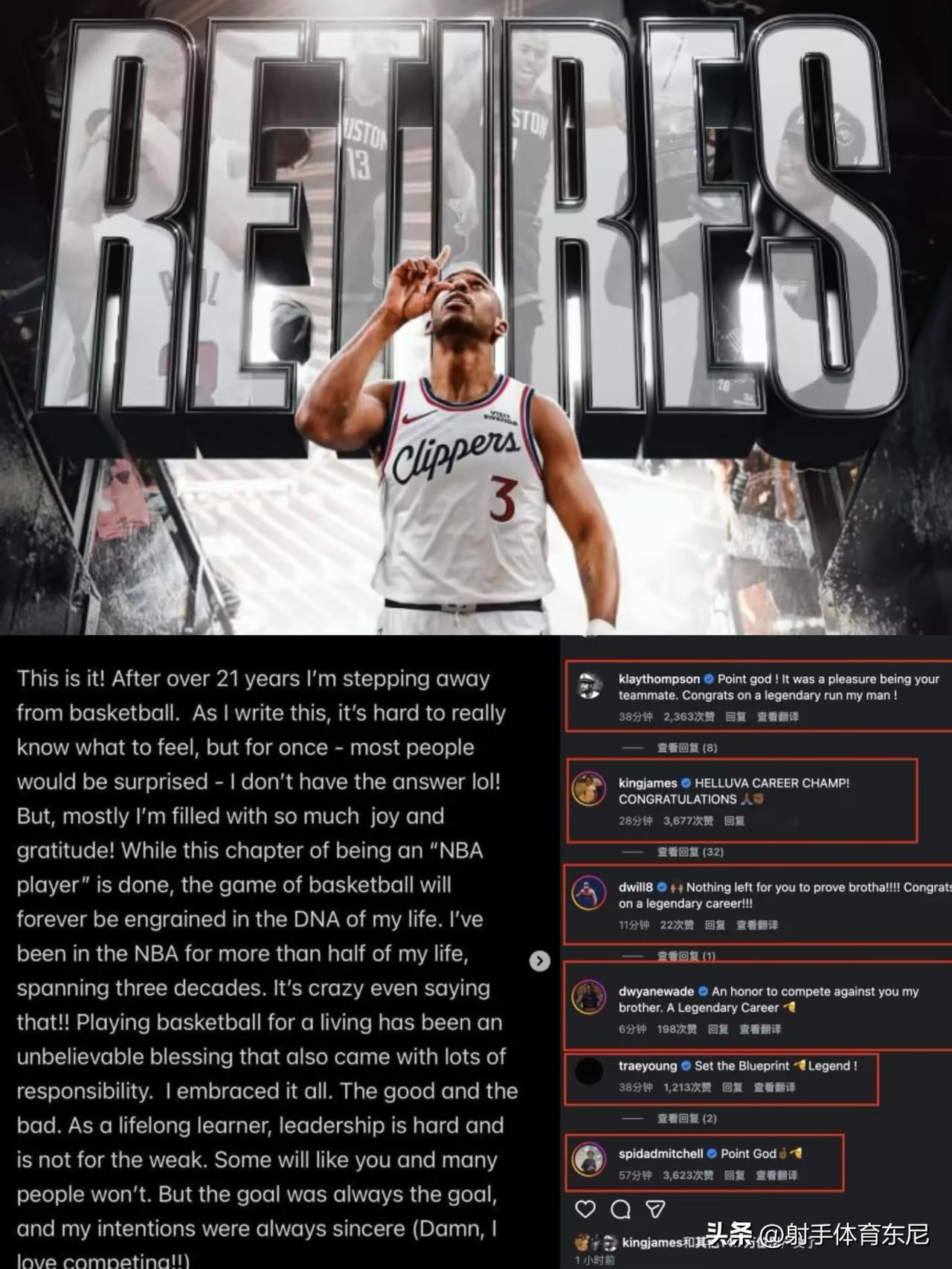 被猛龙裁掉之后,有控卫之神名号的克里斯-保罗社媒软件自宣正式退役,结束自己长达21年的职业历程。 联盟众多明星球员纷纷留言祝福! 克莱:控卫之神!很高兴曾和你做过队友,祝福你在传奇路上继续奔跑。 詹姆斯:非常了不起的职业生涯,祝贺你。 米切尔:控卫之神! 韦德:很高兴曾经与你同场竞技,致敬一段传奇生涯。 特雷-扬:为后辈设定蓝图,致敬传奇。 德隆:你无需再证明什么了,我的兄弟,祝贺你拥有一段传奇的生涯。 …