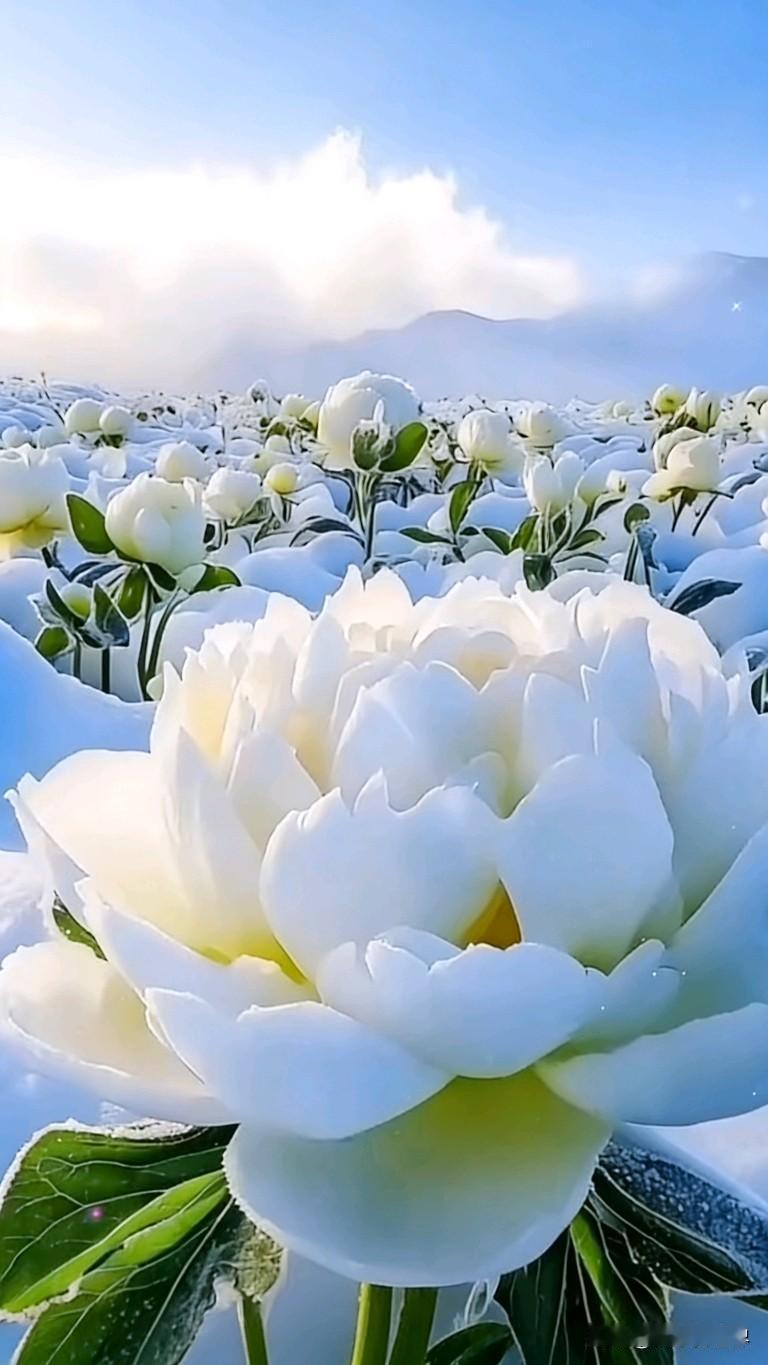 梦幻雪景中的白色花朵,宛如仙境梦幻雪景照 美的白色花海