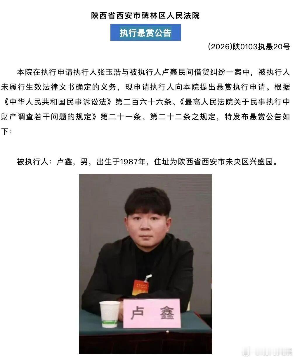 【相声演员卢鑫回应被法院公开悬赏】2月11日,陕西西安市碑林区法院微信公众号发布执行悬赏公告,其中显示相声演员张玉浩与被执行人卢鑫民间借贷纠纷一案中,张玉浩未履行生效法律文书确定的义务,公告称,凡首先向法院提供被执行人卢鑫下落线索,人民法院根据举报线索找到卢鑫并实际控制的,被执行人能够履行全部或部分义务,达成和解或采取拘留措施的,申请人承诺奖励举报者人民币10000元。