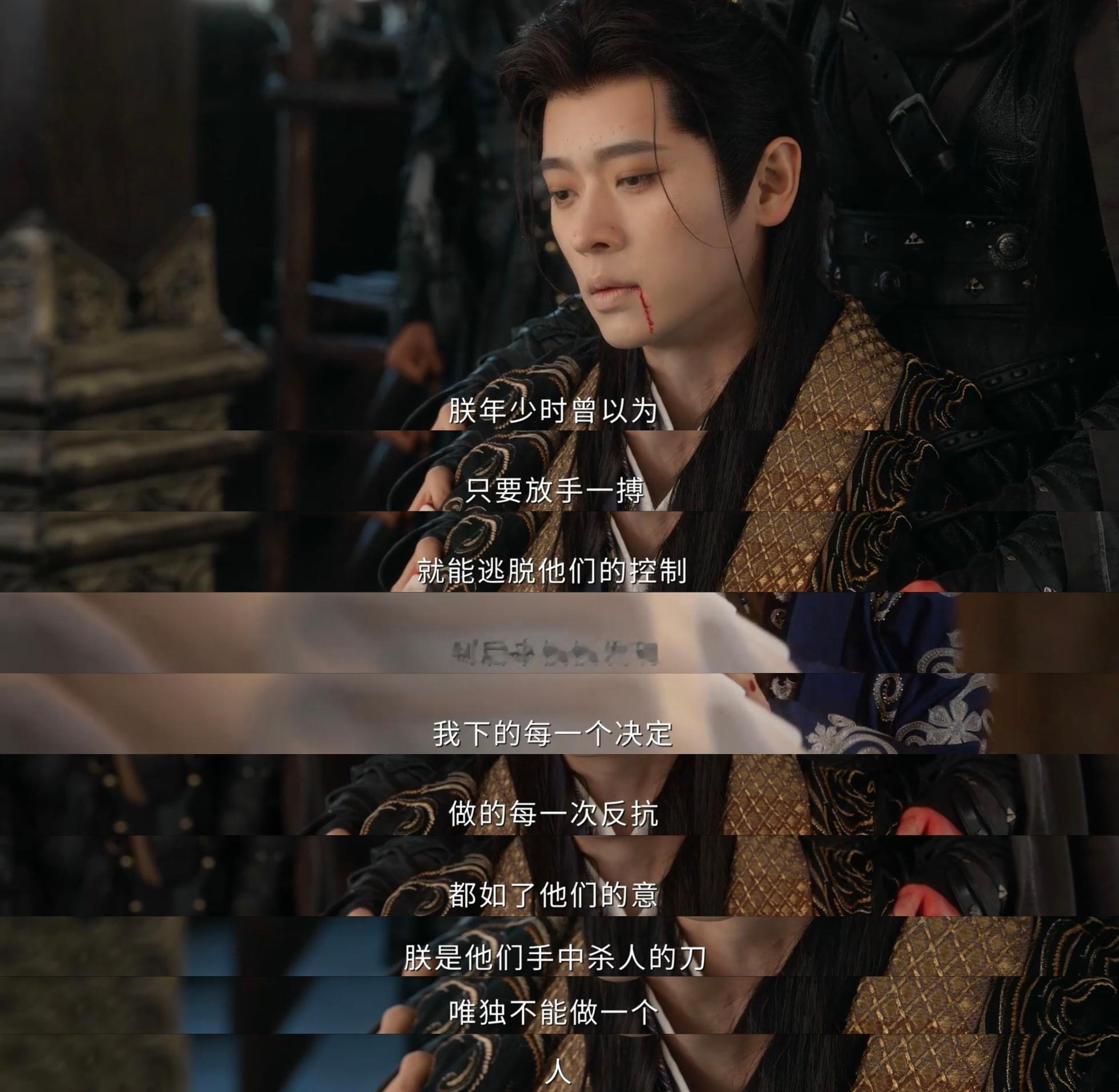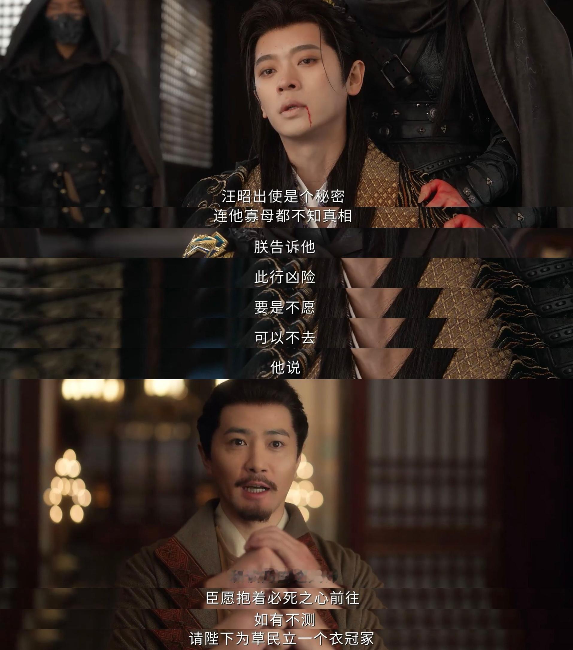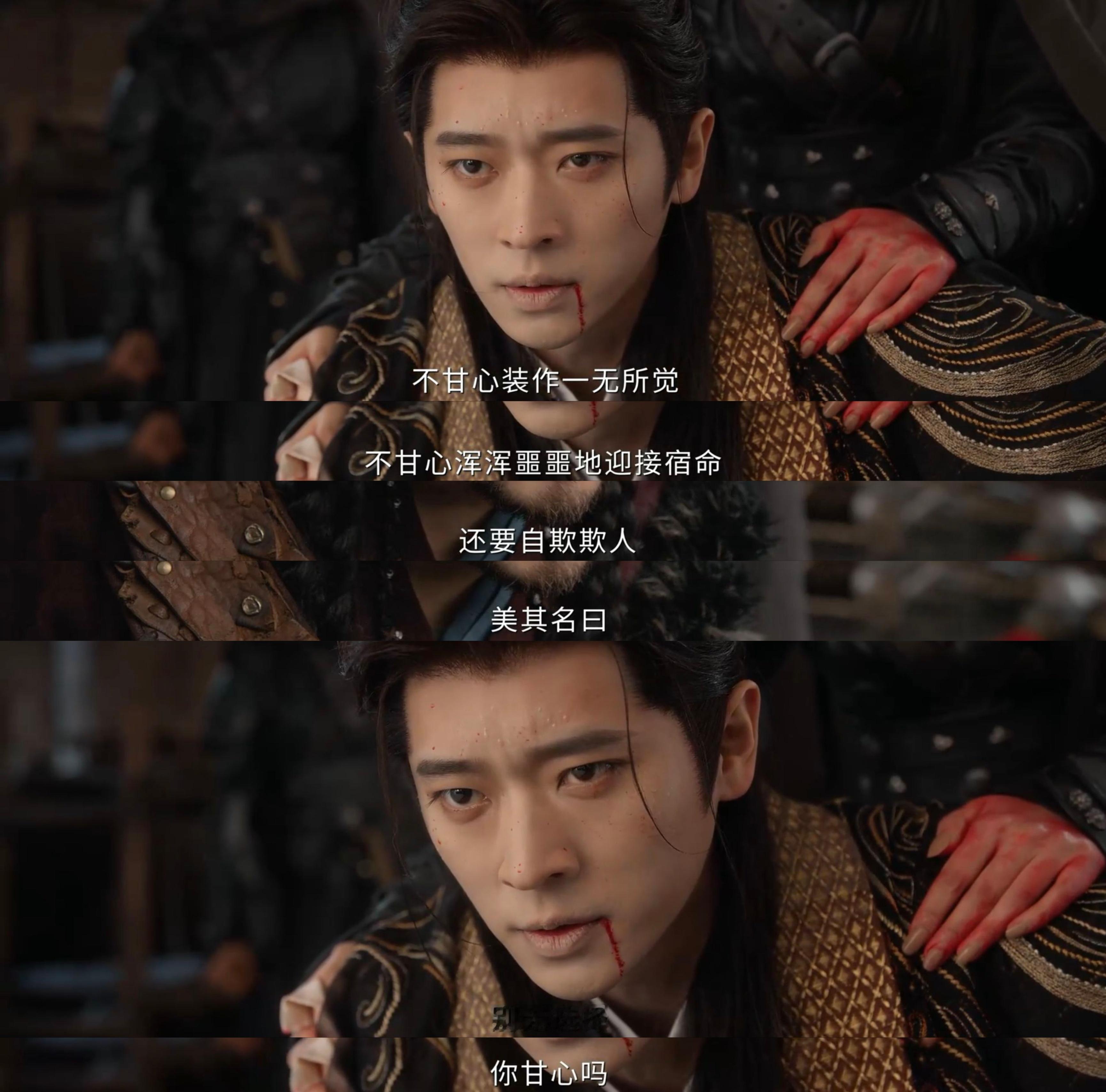 得知汪昭的死讯,丞磊带着夏侯澹,开始了另一程的演技绽放。夏侯澹眼中爆射出的杀意,不是君对臣的悲伤,而是对兄弟挚友的痛失,仇人就在眼前,杀,无赦!丞磊给到夏侯澹的狂怒中,有着彻骨的痛,让人感同身受;但身为国君,身为挚友,夏侯澹要沿着汪昭的路继续走——和谈,这是比复仇更好的告慰,他以同样的傀儡际遇和成长桎梏,向图尔剖开自己的世界,这一段自剖,需要演员高度的共情,否则那大段台词就成了流水,丞磊交出的是💯答卷,此刻的他就是夏侯澹,与夏侯澹一起被操控,被裹挟,一些成为箭成为刀,成为傀儡,还有不甘的心和不自欺的行,正因如此,那两句“你甘心吗”,才如此具有震撼人心的力量。