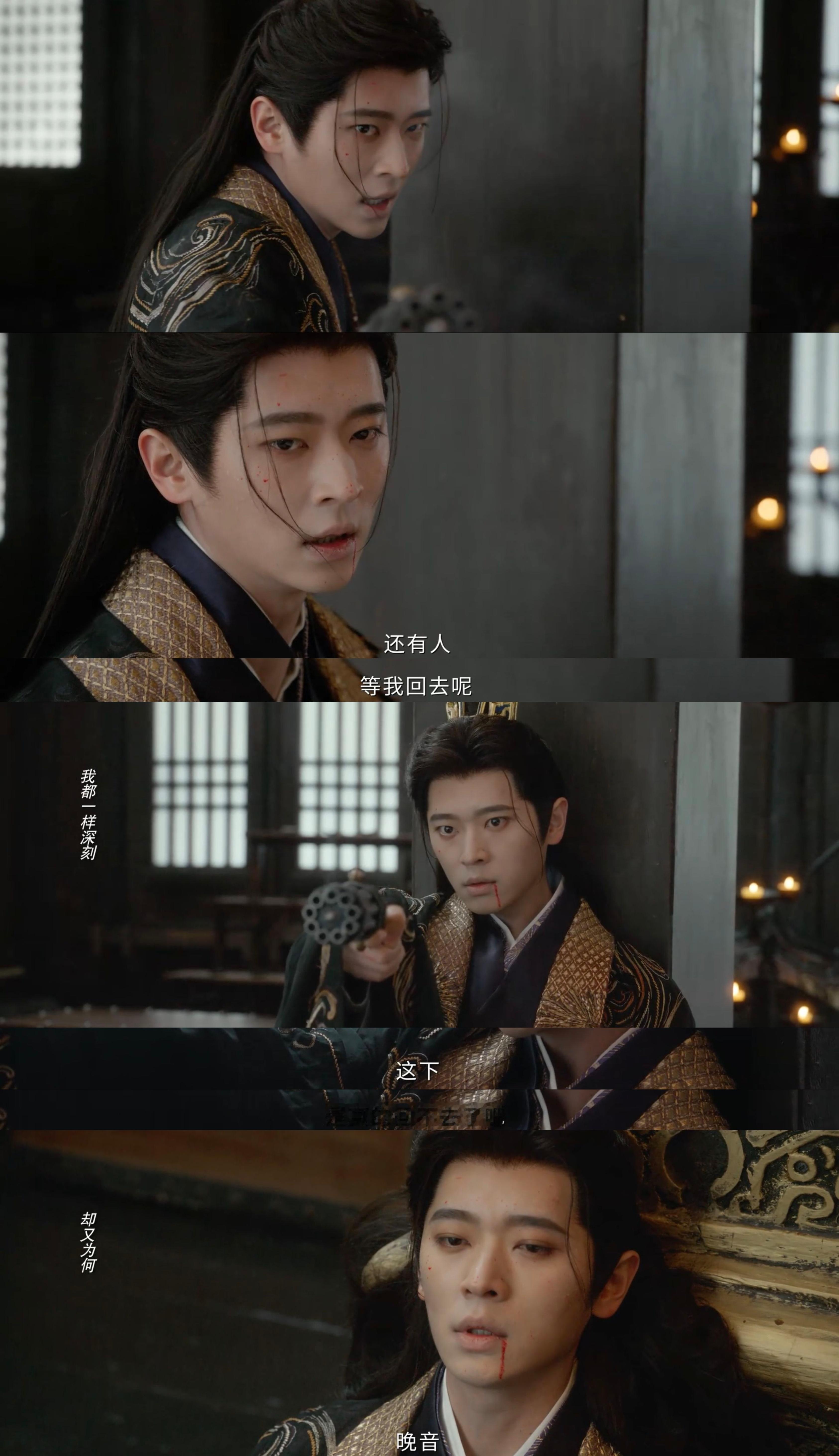 丞磊首先端上来的,是夏侯澹连续的心理变化。丞磊第20集6分47秒 从受伤后,因为“有人等我回去”而苦苦支撑,到最后一发弩箭射出后的无望,身体缓缓顺着立柱滑落,嘴中呢喃“晚音”,这一段落,丞磊把夏侯澹的内心,写在眼里,落在肢体。