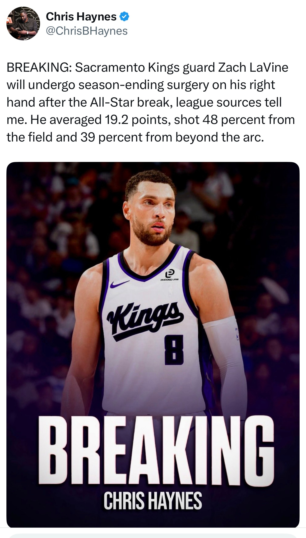 Chris Haynes:扎克拉文右手手术赛季报销。