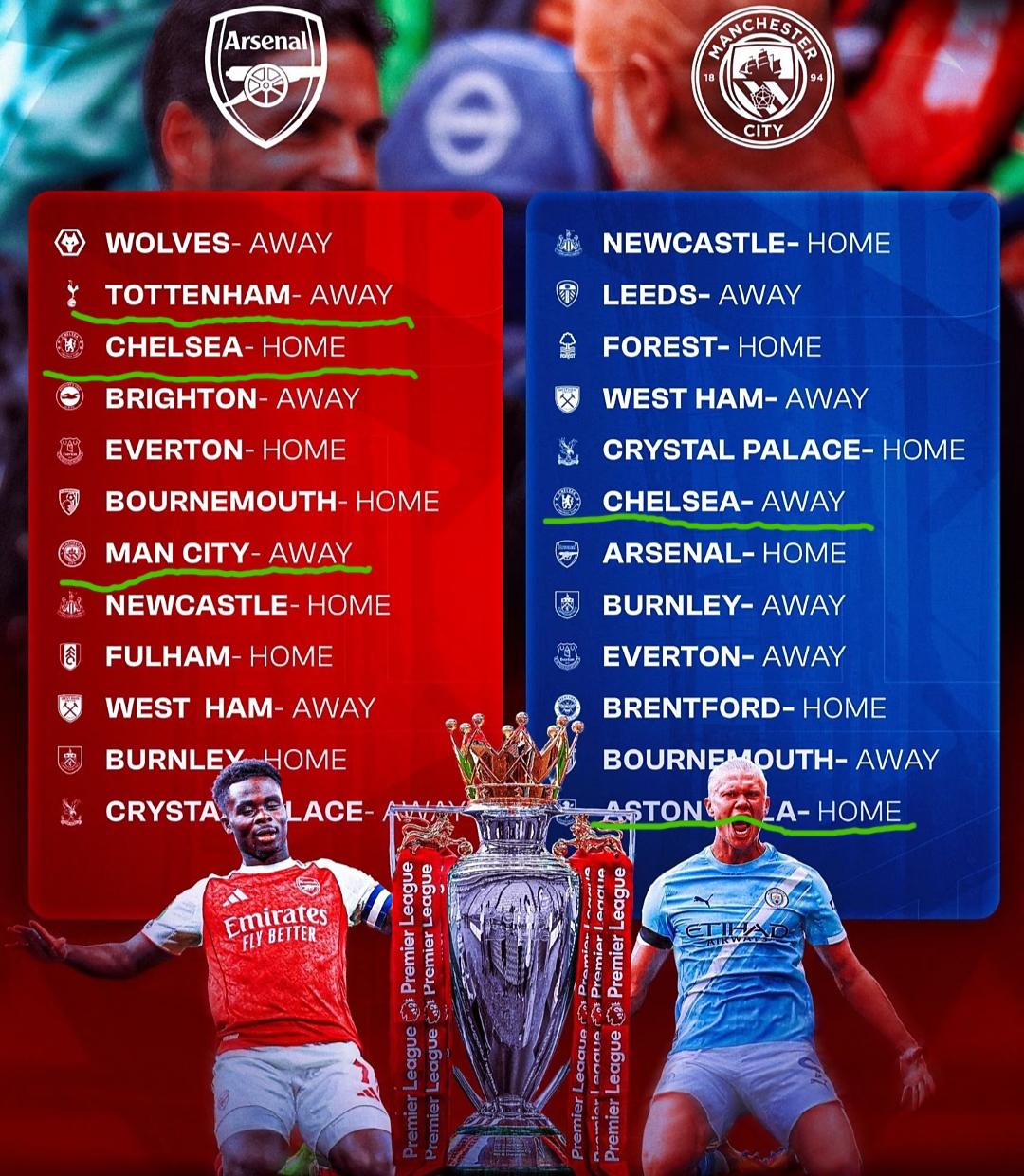 曼城、阿森纳两支英超夺冠球队接下去12轮将要面对的对手。大家觉得哪个球队的赛程更