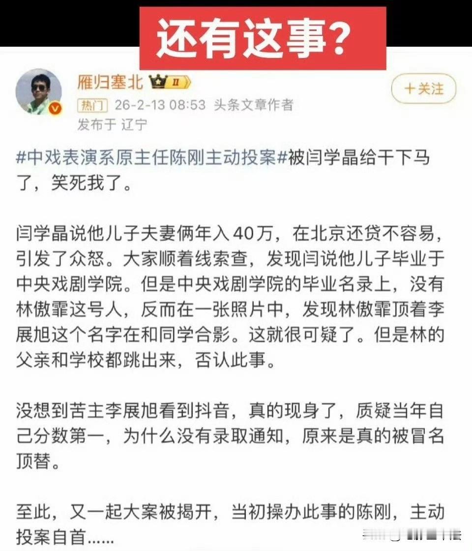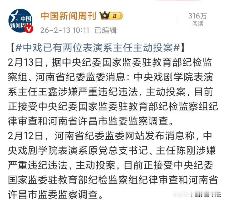 中戏三任系主任都是主动投案自首,无非就是以下三种原因: 第一,知道在严查,已经逃不掉了,不如争取宽大处理; 第二,希望将处罚降到最低,掩盖其他更严重的违法行为; 第三,心灰意冷,通过这种方式自保,逃避掉入更大的坑; 你觉得哪种可能性最大? 值得深思的是,为什么高薪和高社会地位没有养出高的道德水准,这个问题是我们急需考虑,也急需解决的,因为这阻挡了无数有实力、有梦想的年轻人向上发展的通道!
