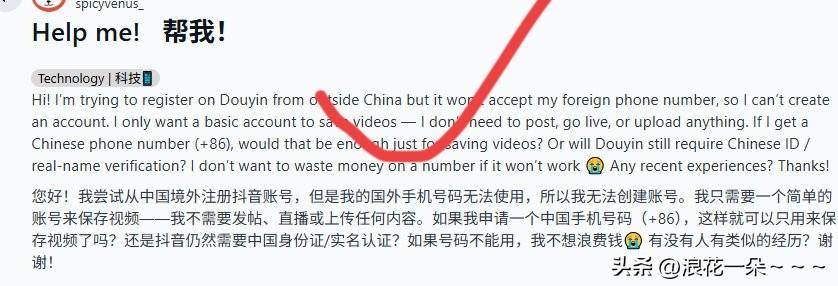 帮我!Help me.!您看看,这是一位外国网友的求助信号,大概意思就是想弄一个国内手机号码,注册一个抖音账号在国外使用。也不知道他急忙需要这个手机号码干啥,难道他不知道注册抖音要实名的吗?他说是为了保存视频?难道这些视频都是在国外见不得人的东西?想做一个新的牢A?真是奇了怪了,我想注册一个x都很难呐!这不是一样的道理吗?[捂脸]