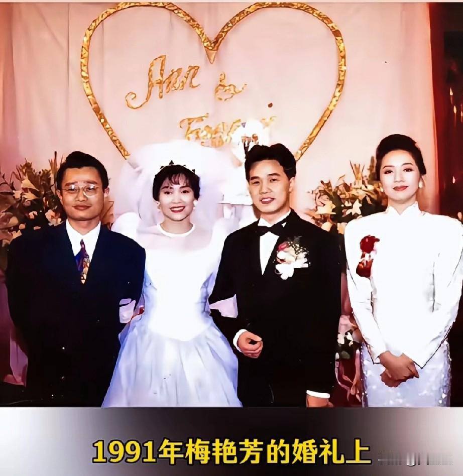 1991年梅爱芳的婚礼上 梅艳芳以伴娘身份现身, 身着一袭白色中式礼裙温婉大气。姐姐婚纱加身明艳动人,姐妹俩一裙一纱,高贵典雅的气质尽显,画面定格了这份温情与美好。