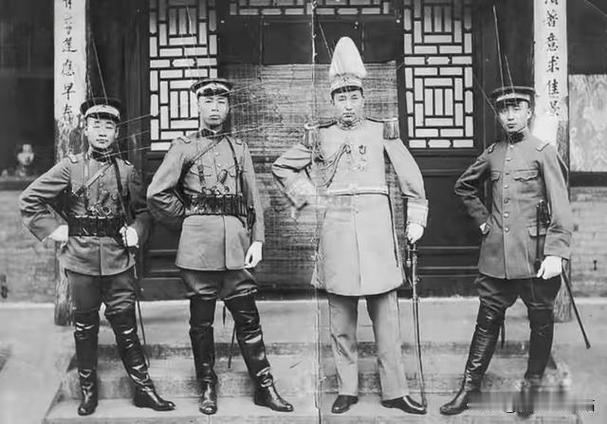 这张照片的四人皆为奉军军官,身后是一处中式建筑,门楣上的对联“自有奇逢应早,酒消患求佳”。中间军官身着带有勋章的礼服,头戴高帽,姿态自信,两侧的青年军官则穿着标准的奉军军装,脚蹬马靴,手持军刀,是他的亲信或部下。 照片拍摄于20世纪20年代初,正值奉系军阀势力鼎盛时期,在张作霖的领导下,奉系军阀成为北洋政府后期最强大的势力之一。照片中的青年军官,正是奉军中的“新派”力量。他们大多毕业于正规军校,思想较为开明,主张改革奉军,反对旧军阀的腐朽统治,这也为后来郭松龄反奉埋下了伏笔。