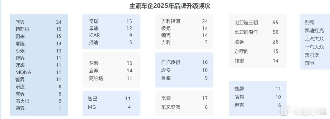 根据艾拉比发布的《2025年OTA市场活动报告》,2024年,开展汽车OTA的品牌为92个,升级版本数为751个;2025年,汽车OTA的品牌缩减为85个,升级版本数为792个。智能汽车越来越多,汽车OTA的品牌反而变得更少,就连频次也几乎与2024年持平。