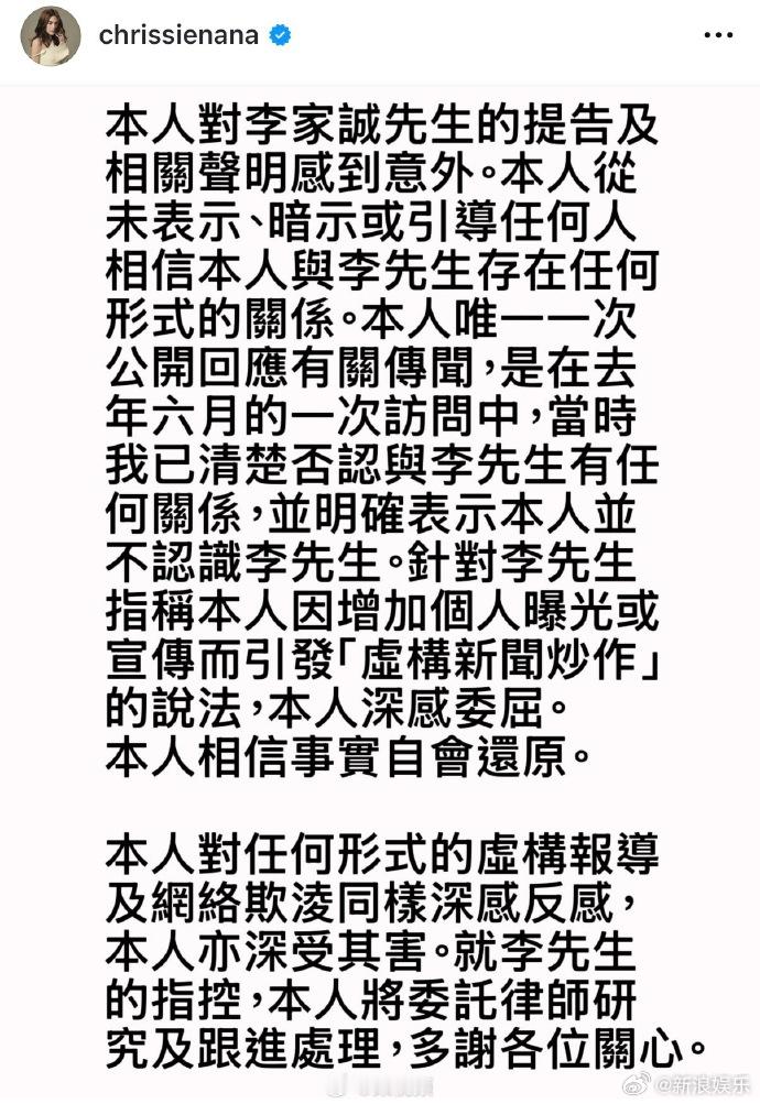 周秀娜回应被李家诚提告 据港媒13日报道,商人李家诚告周秀娜诽谤及骚扰。刚刚,周秀娜发文回应称对李家诚先生的提告及相关声明感到意外,“本人从未表示、暗示或引导任何人相信本人与李先生存在任何关系”,她称针对李先生指称自己因增加个人曝光或宣传引发虚构新闻炒作的说法深感委屈。