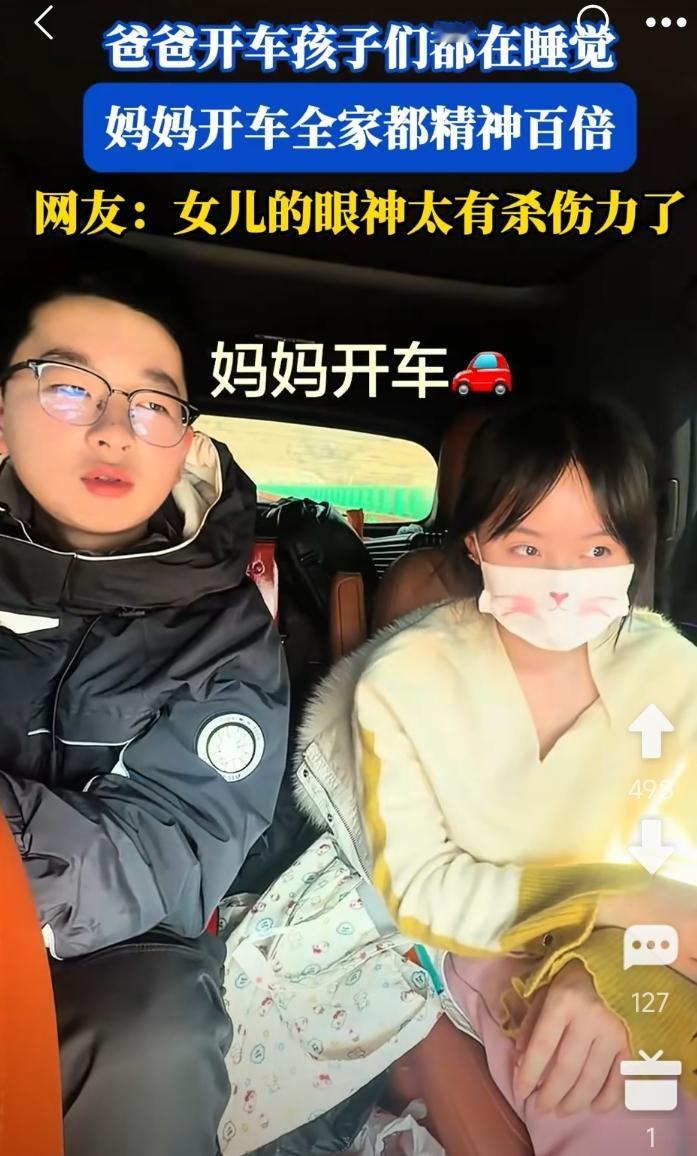 父母带儿女回乡下老家过年。 父亲开车时,儿子和女儿都在睡着大觉。 换母亲开车后,儿子和女儿都睁大着双眼,死死盯着路面。 妈妈说,你们继续睡。 儿女齐声说,我们不困。 妈妈说,这是困不困的问题么?是你们把我整的都不会了。