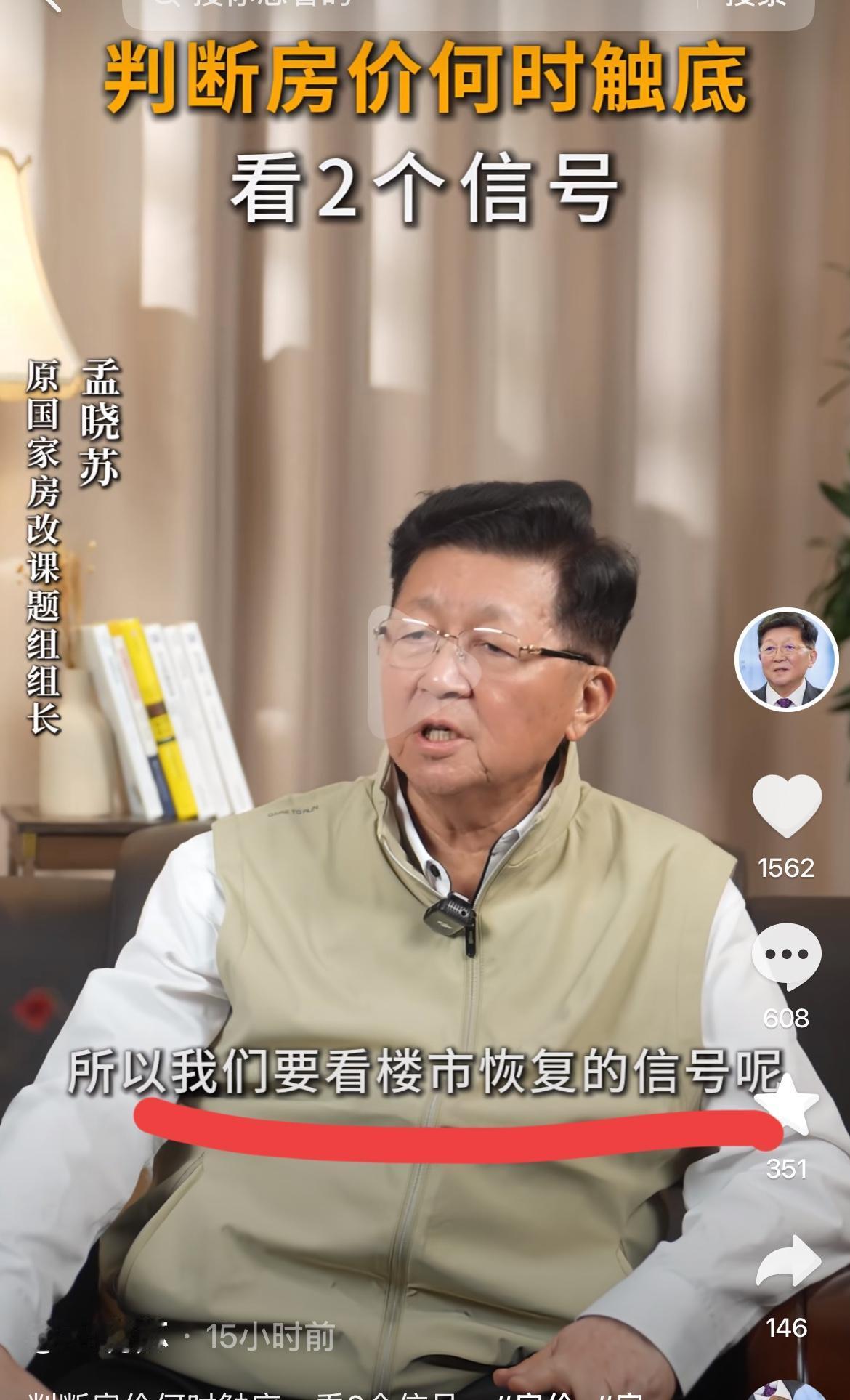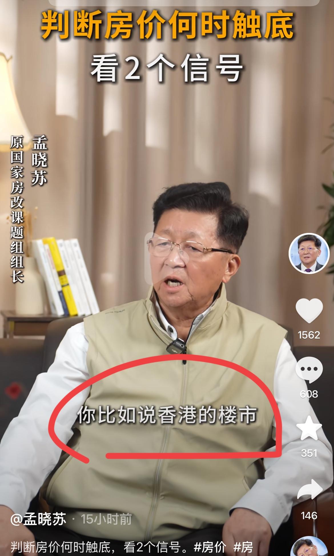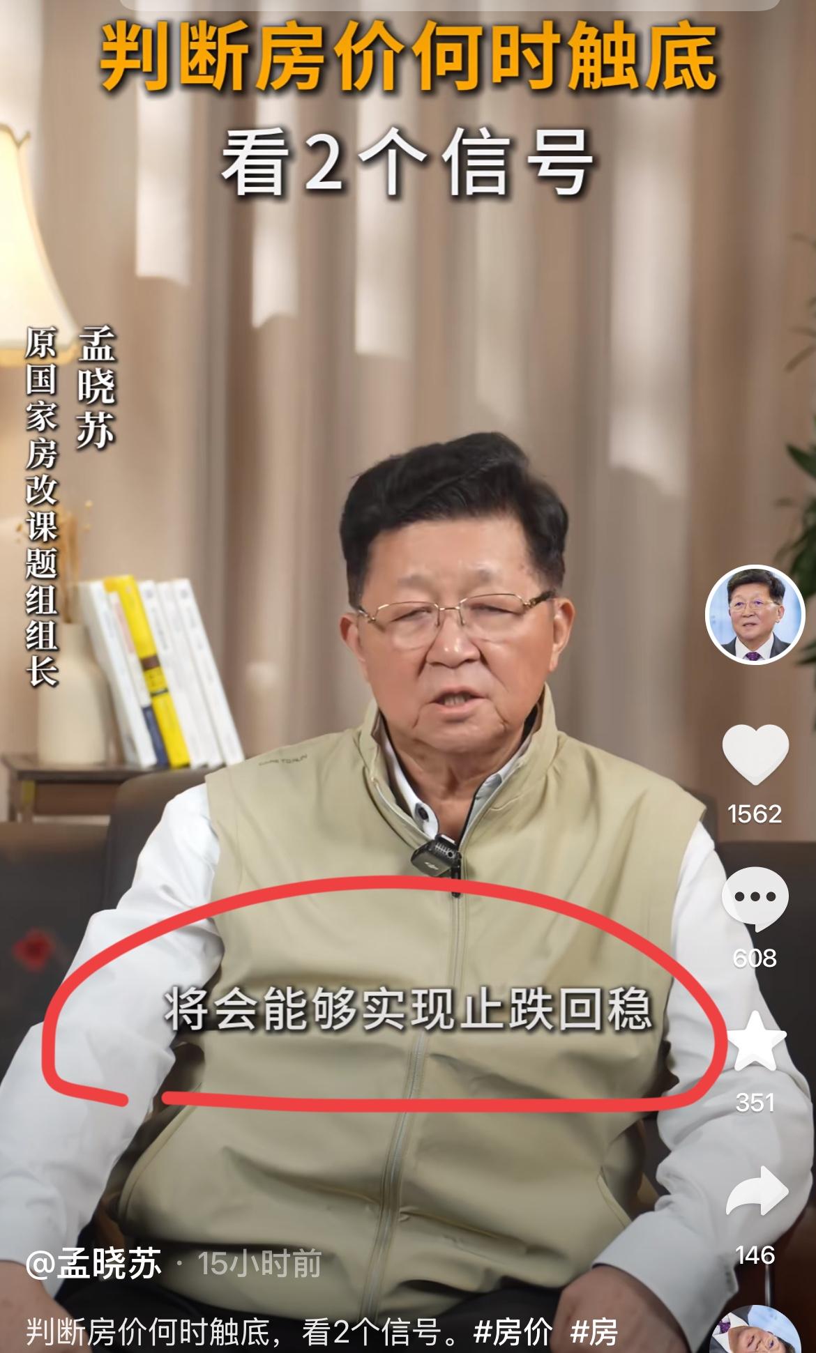 房地产之父孟晓苏,孟总谈到了最近房地产要反弹的迹象!!他认为,有两个重要指标决定了房地产要复苏了,2026年大概率是要稳定,并回升,就算上半年不行,这半年肯定能行! 孟总给出了两个重要指标,一个是面粉卖的比面包还贵了,啥意思,就是开发商现在拿地的价格大幅上涨,这说明市场信心和预期外在快速恢复,这就是上涨的一个重要指标! 还有第二个指标,就是去库存取得重大进展,都消化的差不多了!! 尤其,孟总还谈到了香港楼市的复苏,一听过中房集团要拿200亿帮助香港振兴楼市,孟总表示,香港市民都兴高采烈,信心满满了!!孟晓苏被誉为中国房地产之父,原中房集团董事长,房改组组长~ 孟总此前精彩地讲述了当年他带队去香港救市的经典案例~ 当年,香港因为楼市不振,连续下跌了五六年,顶不住了,官方邀请著名房地产专家孟总带队去东方明珠救市,孟总研究后发现,事实问题并不复杂,只要让房价涨起来,问题轻松解决,为何房子没人买,主要是信心不足,为何信心不足,主要是担心房价下跌,怎么才能让老百姓不担心下跌,涨起来,他们就不担心房价下跌了! 这逻辑形成闭环了,完美啊!! 孟总最后说,经过一番运作,香港房价终于大涨,老百姓信心大增,纷纷进场接盘,楼市得救了,香港房价一飞冲天,迅猛发展,刺激经济高速发展很多年! 不得不说,还是孟总高明啊,大陆和香港的房地产价格大涨,快速迅猛发展,离不开孟总的巨大贡献! 又要反弹了吗? 关于房地产,你有什么高见呢?