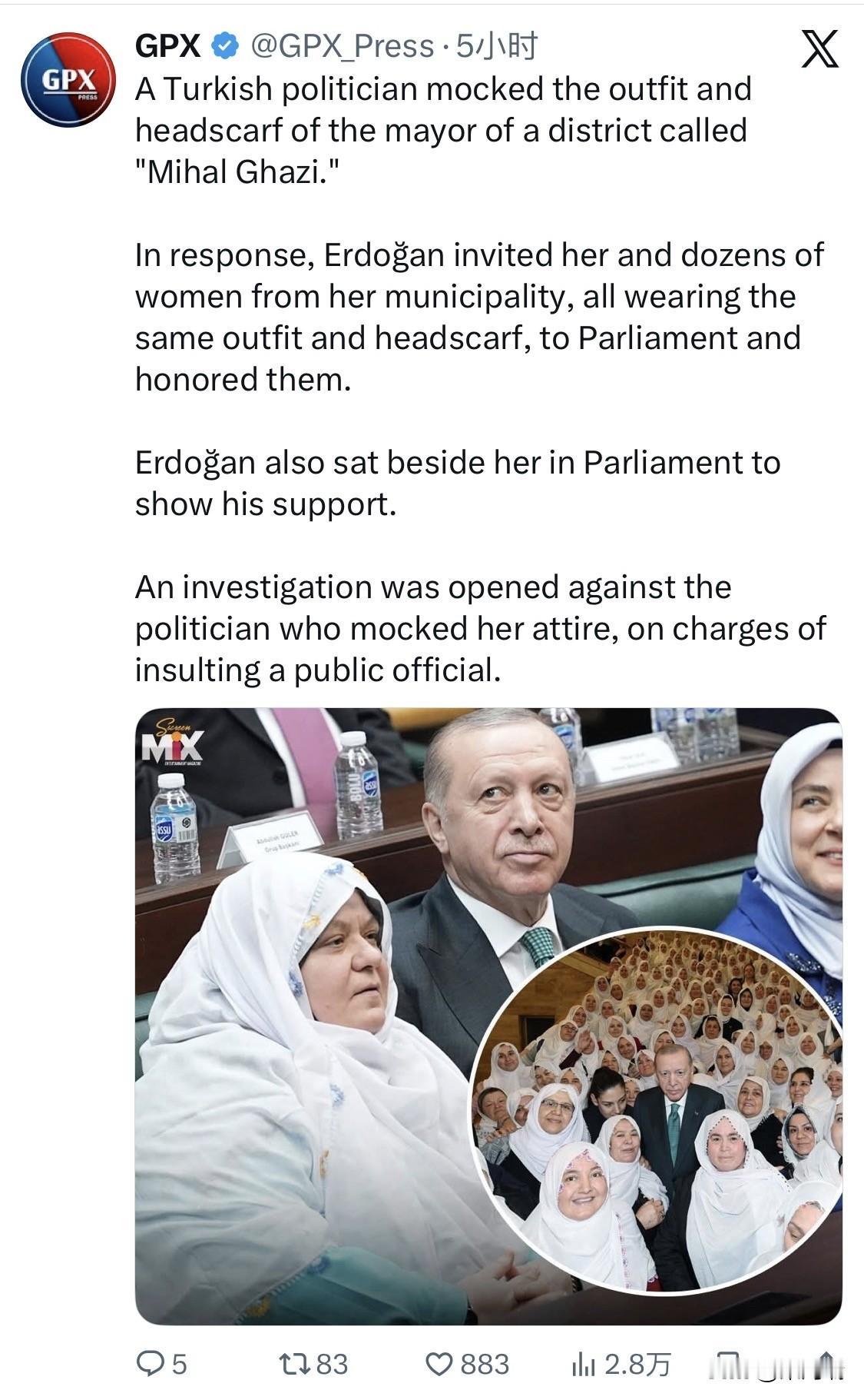 这是一个发生在 2026年2月 的真实政治事件,被嘲讽的官员是 Zeynep Güneş Akgün(泽伊内普·居内什·阿克金),她是土耳其埃斯基谢希尔省 米哈尔加齐 (Mihalgazi) 区的市长(Mayor)。 起因:极右翼政客 Mehmet Emin Korkmaz(隶属于胜利党 Victory Party)在社交媒体上发布了 Akgün 穿着当地传统服饰和头巾的照片,并对其着装进行语言侮辱和嘲讽。 土耳其总统埃尔多安邀请 Akgün 以及来自米哈尔加齐区的约 100 名妇女 前往首都安卡拉参加正义与发展党(AKP)的议会小组会议。 这些女性均穿着与 Akgün 相同的传统服饰和头巾以示团结。 埃尔多安在会议期间特意安排 Akgün 坐在他身边,并向她们表示致敬,以此回击外界对宗教和传统服饰的霸凌行为。 法律后果: 警方调查:土耳其当局已对 Korkmaz 展开调查,他因涉嫌“公开侮辱公职人员”和“煽动民众仇恨”被拘留。 政治后果:Korkmaz 所属的胜利党也已启动程序,准备将其开除出党。 这一事件在土耳其引发了关于个人身份、宗教信仰以及女性在公共生活中着装自由的大规模讨论。