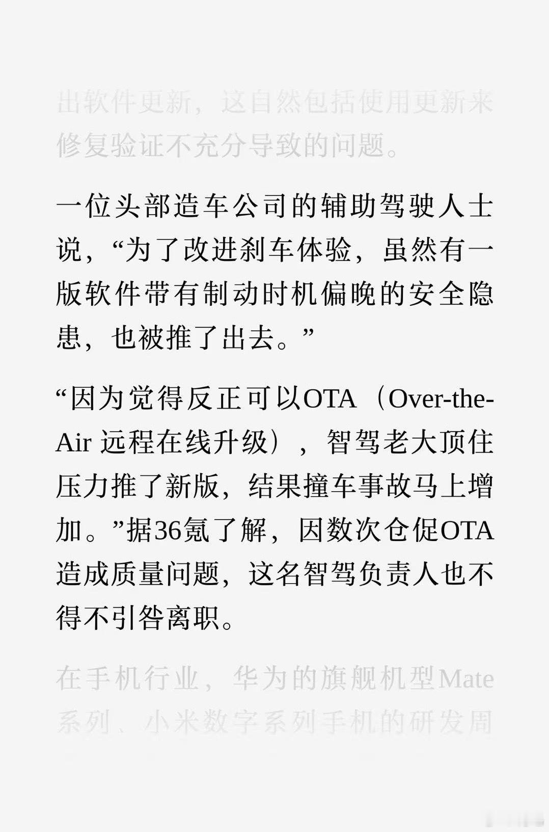 「一位头部造车公司的辅助驾驶人士说,“为了改进刹车体验,虽然有一版软件带有制动时机偏晚的安全隐患,也被推了出去。”」